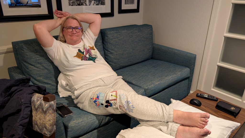 We spent the day at our hotel doing very little. We slept in (intermittently, while checking on Benjin’s flight), then enjoyed lunch [again] at the Cheesecake Factory a couple blocks away. I had the same Louisiana Chicken Pasta that I had the other day (and it was just as good as it was then) and she had Spicy Ginger Beef Tenderloin, which she just loved, so maybe that will be an experiment to try cooking at home sometime. We watched S2E3 of The Pitt, a couple episodes from the last season of Cobra Kai, and went to bed early (well, at least she did–I’m still awake). Here she is lounging before The Pitt.