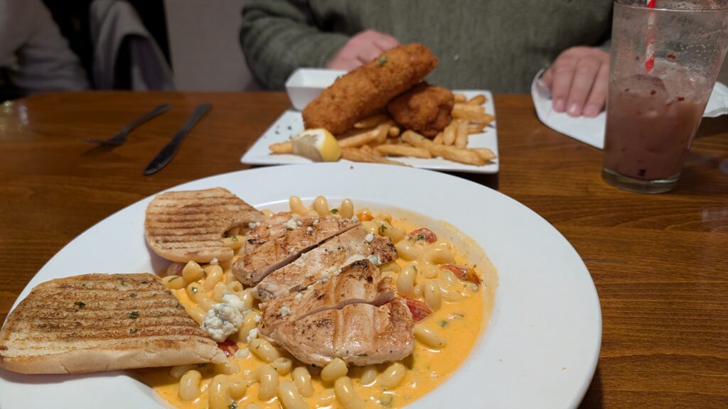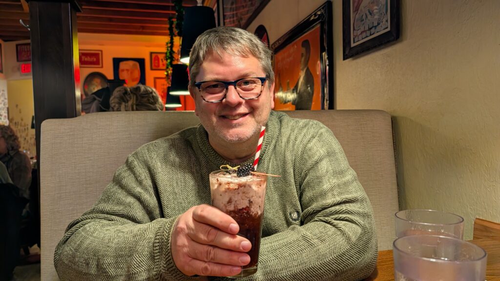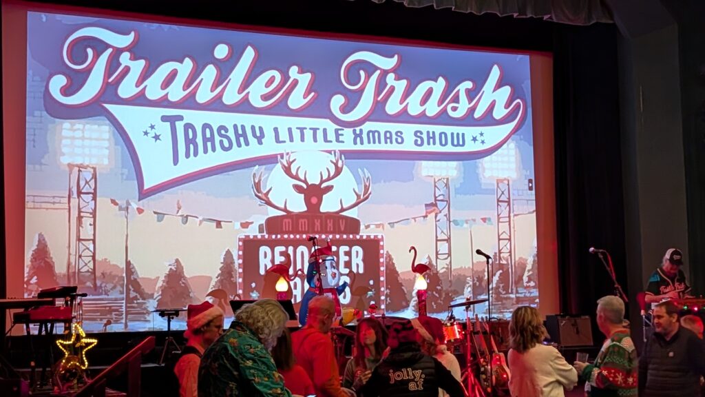 We ate at the pub next door to the theater. I had Buffalo chicken pasta. I liked it so much that I had to ask for a SPOON so I wouldn’t miss any of the sauce. Keith had a dirty soda – blackberry lemon syrup, cream, and Coke. It was good. We finished and paid and walked next door as the general admission doors opened. Our timing was impeccable for the Trailer Trash Christmas show.