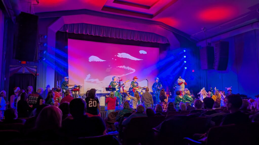 Keith thinks fewer than 10% of the audience had not seen them before. So many people were VERY dressed for a trashy Christmas party. Women were wearing tree skirts and men had on Elf costumes. It was great. A lot of people were down front dancing. At intermission they handed out puffy “snowballs” about 2 inches in diameter. Our job was to pelt the band when they came back for the second half. We did and they returned fire. Snowball fight! The snowballs flew throughout the whole second act. Very enjoyable. They had old Christmas cartoons playing behind them – think creepy old Christmas (like creepy old Halloween, but not as scary). I wish I could remember songs they did. I do remember Rockin’ in My Christmas Underwear...but everything else is a blur.