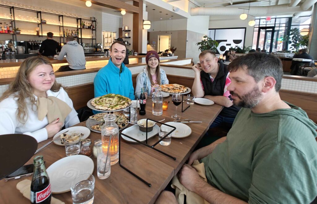 Benjamin ventured forth for Mark’s 36-and-a-half birthday. That is why he is here this weekend. They did golf swinging and pizza eating. The roads were okay in the towns. Look at the new girl! She is Anastasia. She is from Russia. She hangs around with Mark. Happy half birthday, Mark.