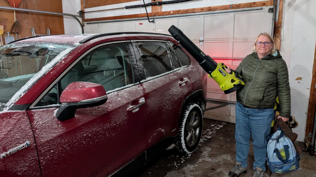 We had super light fluffy snow the other night and I hypothesized that you could use a leaf blower to blow off your car – now that leaf blowers come in cordless. Keith put ours in the car for me to try. It started snow-globe snowing midafternoon and I had plenty of snow to blow away. It worked pretty well. It was snowing so hard that I had to go around twice to blow off what accumulated while I was blowing, but it only took a couple of seconds. I liked it.