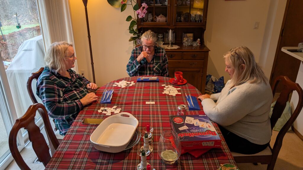 Karen was on her way to pick up Liz’s dogs for the day. Liz has two young dogs and is fostering a puppy for Christmas. Nancy and I enticed Karen to stay a bit with an offer of Rummikub. She is so good at it – it’s fun to play with her. We played several rounds. I went out once. Ha!