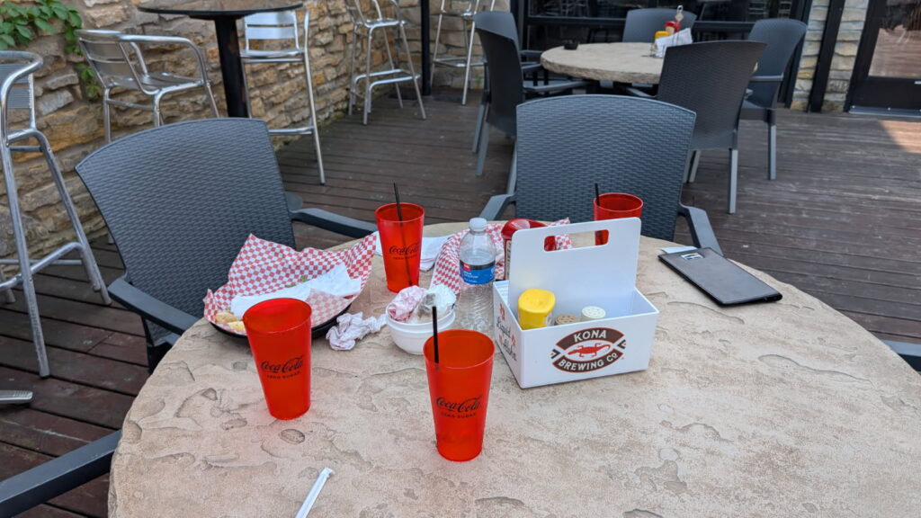 When we got to the restaurant near the festival that we had chosen, it turned out there was only outdoor seating. What are the chances? I didn’t know restaurants ever had that, so I would have said 0%. We picked an isolated table in the shade, and it was great. Jenny stopped in the restroom to change out of her band shirt as we went to pick the table. We all sat down and she started, “Imagine you are 13 and you are going on a vacation.”