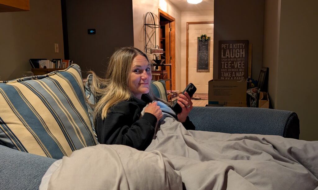I’ve had a comforter on the blue chairs since surgery. It is big enough to cover both chairs. It is big enough if I heat up part of it, there is still a cool part to pull over. Maren came over to chat over some of the problems in education, Disney popcorn buckets, and what a great spring break might feature (or something like that). When she saw the new coziness added to the blue chairs, she said she would never leave. But she did – great time while it lasted.