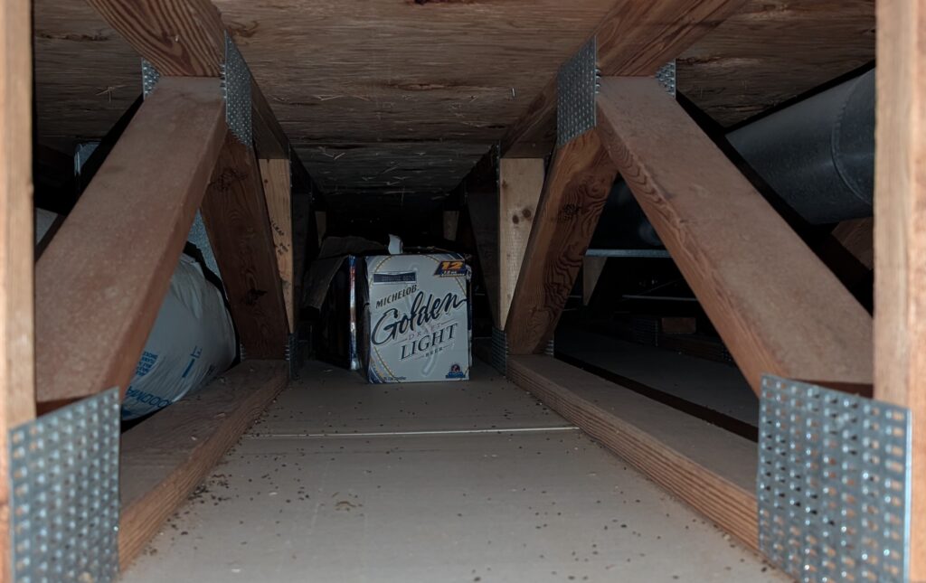 Keith has continued looking at pipes in the basement ceiling. He did not find shut off valves today, but he did find beer boxes.