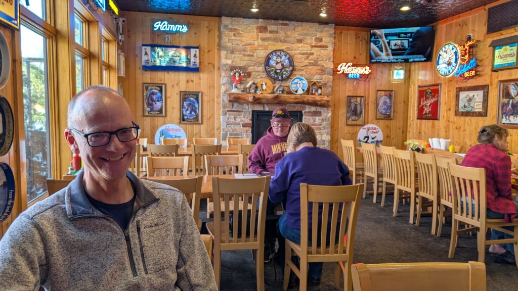 After lunch, he met friend Brian for lunch at King’s. King’s has FOUR full pages of burger choices and is well-known to be really good. We’ve never been there because it is across the street from Wiederholt’s Supper Club and that will always be our choice. Keith’s burger was reported to be very good: it was called The Tourney and had apple and pineapple chunks, pico de gallo, garlic aioli, crispy onions, and sweet chili sauce.