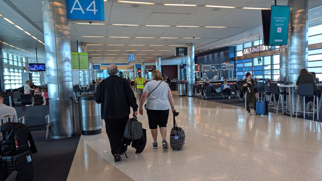 Our flight left half an hour before Gary and Julie’s. Our second plane, out of Atlanta, was delayed an hour, so we had plenty of time to visit the lounge. The food situation was strange. There was a nice salad bar set up, with 4-inch plates. Tricky. There was plain rice. Huh. There was chicken noodle soup with little cardboard bowls. Okay. There were tiny peach cobbler jars, some with just cobbler. I ate a ton of wasabi stuff – tiny crackers, peas, and whatnot. It was probably more fun than if it had just been fill-your (regular sized)-plate.