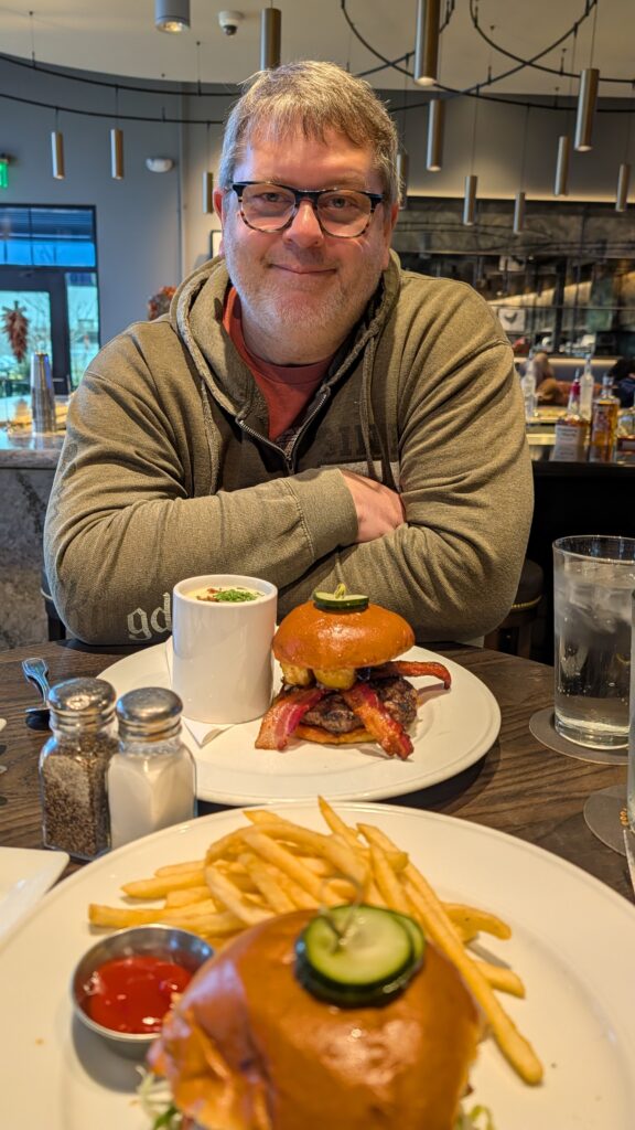 Keith took me because he isn’t interested in me driving around with only one good eye and I am so willing to be pampered. We needed to go grocery shopping anyway, so it was just a stop along the way. On our along-the-way, he suggested we go to Hazelwood for lunch because it is Monday and Monday is smoked Gouda potato soup day. He didn’t have to twist my arm. He had an amazing Blackberry Brie burger (brie curds and blackberry jam?) and a cup of soup. I said I would just have a taste of his upgrade-fries-for-soup cup. I ordered a chicken sandwich with all sorts of stuff on it for fancy, but I now know the correct play is just a bowl of the soup. It was better than I remembered it, because I had talked myself out of thinking that it could have been that good.