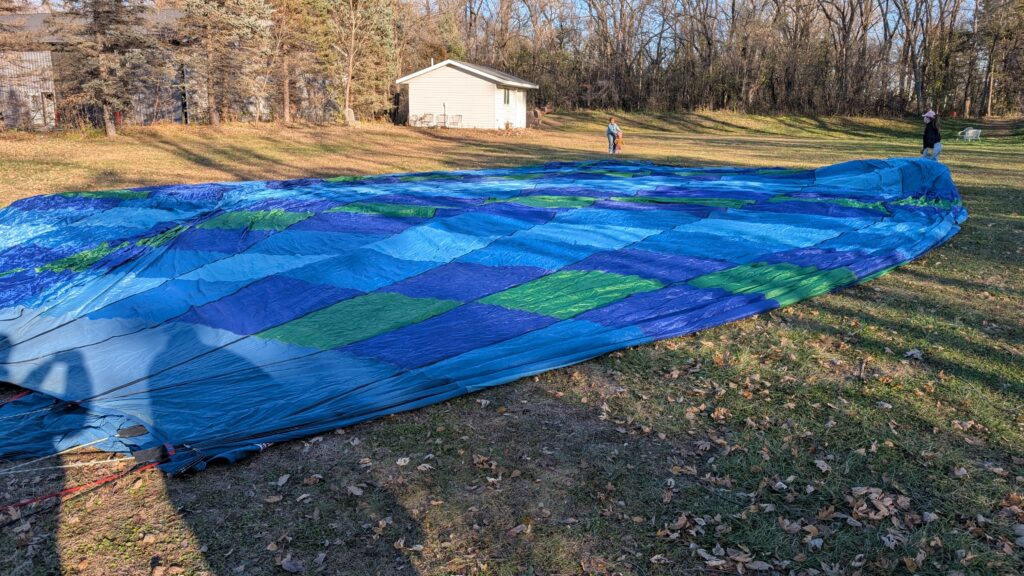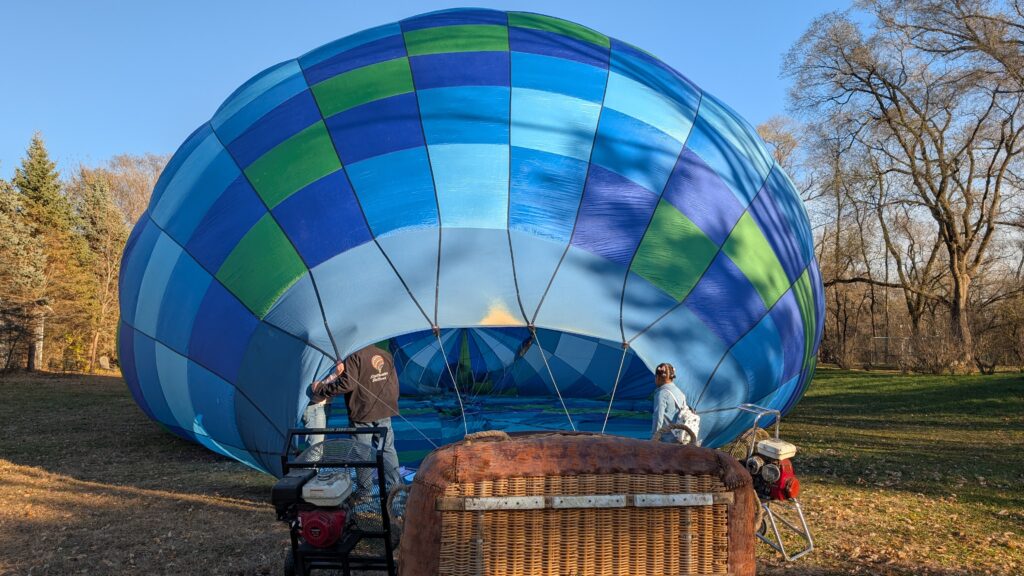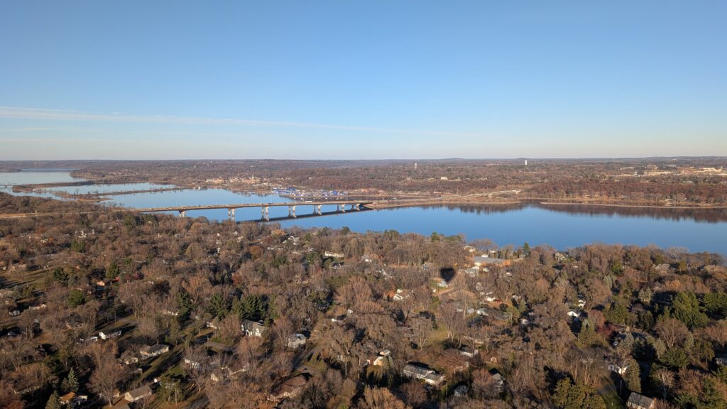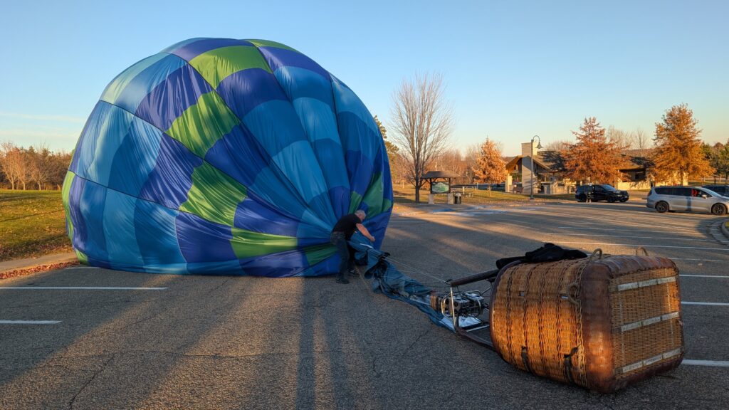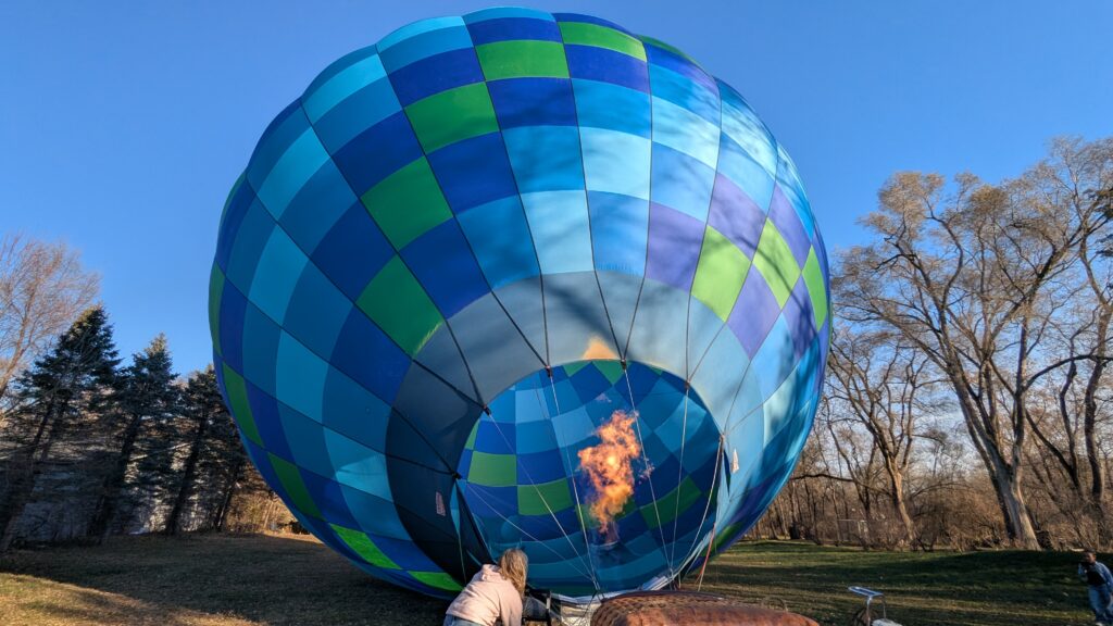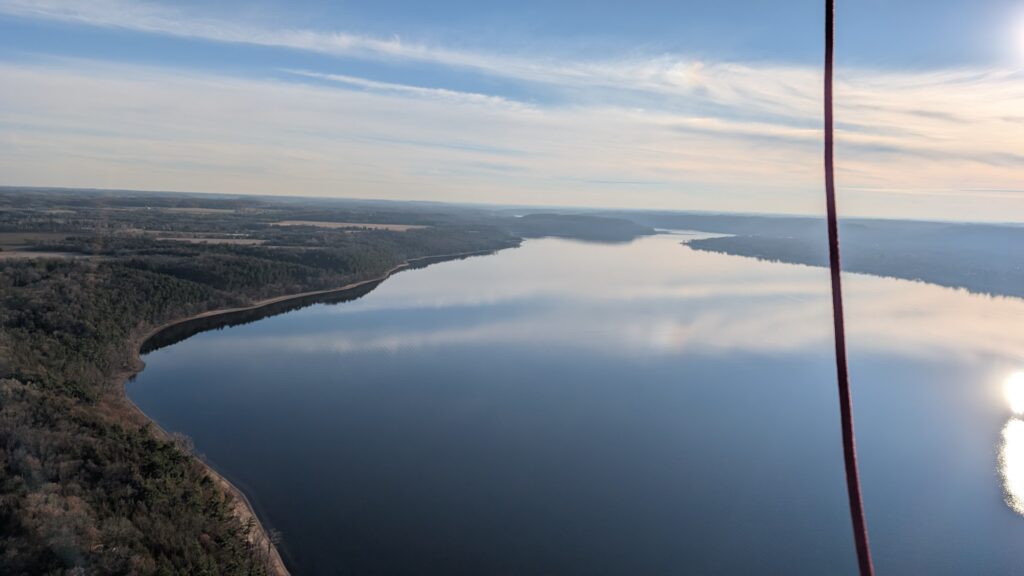 We could not have asked for a better day. It was almost 50°, sunny, and clear. There was also precious little wind. She had to maneuver the balloon up to over 2600 feet to find enough wind to push us over the Lower St Croix River. There was so little wind at the surface that the river was like glass and since most boats have been stored for winter by this time, there were only a couple boats on the river. Seeing the empty, smooth river was a new experience. I recently read about how one pilots a balloon. You can’t steer it in a traditional sense (through some mechanism like a wheel/rudder). You move up or down by either adding heat to the balloon or letting out heat via vents at the top of the balloon using ropes. A balloon pilot is more meteorologist than pilot. Winds change directions at different altitudes, so you need to understand where these changes occur and move up or down appropriately to move in the desired direction. It’s both art and science and was very interesting to see firsthand.