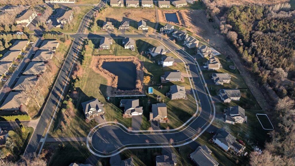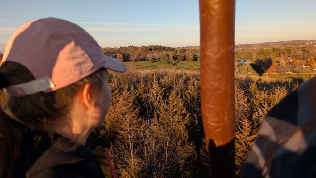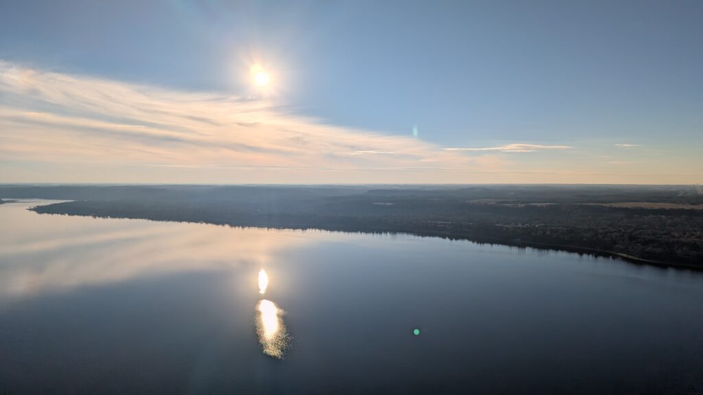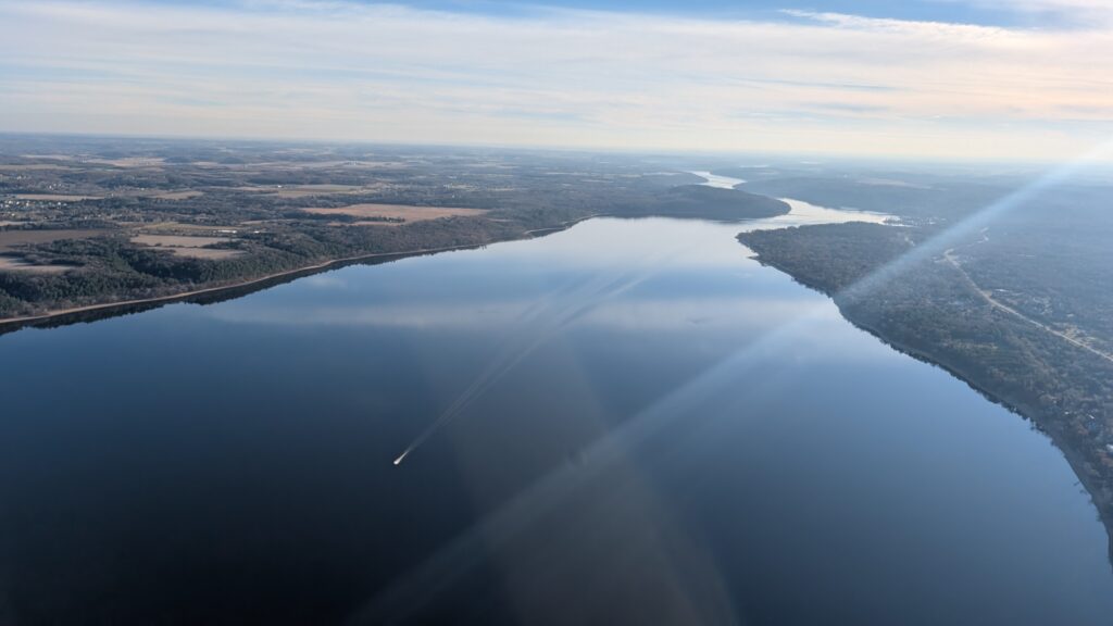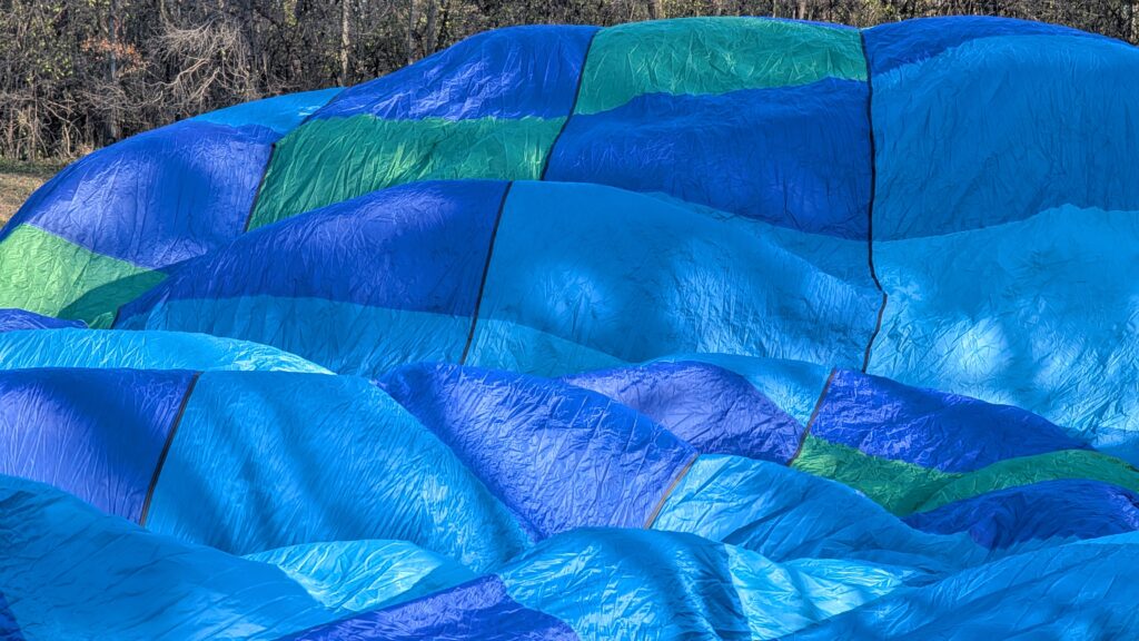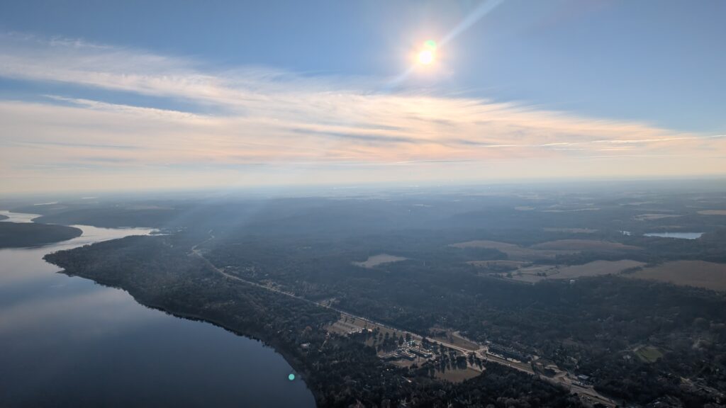We could not have asked for a better day. It was almost 50°, sunny, and clear. There was also precious little wind. She had to maneuver the balloon up to over 2600 feet to find enough wind to push us over the Lower St Croix River. There was so little wind at the surface that the river was like glass and since most boats have been stored for winter by this time, there were only a couple boats on the river. Seeing the empty, smooth river was a new experience. I recently read about how one pilots a balloon. You can’t steer it in a traditional sense (through some mechanism like a wheel/rudder). You move up or down by either adding heat to the balloon or letting out heat via vents at the top of the balloon using ropes. A balloon pilot is more meteorologist than pilot. Winds change directions at different altitudes, so you need to understand where these changes occur and move up or down appropriately to move in the desired direction. It’s both art and science and was very interesting to see firsthand.