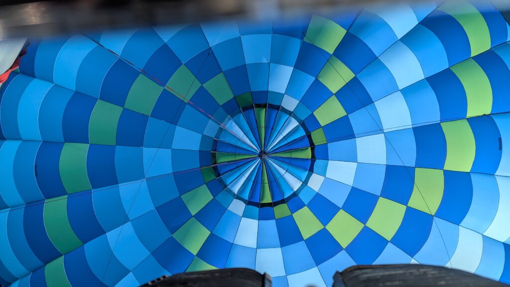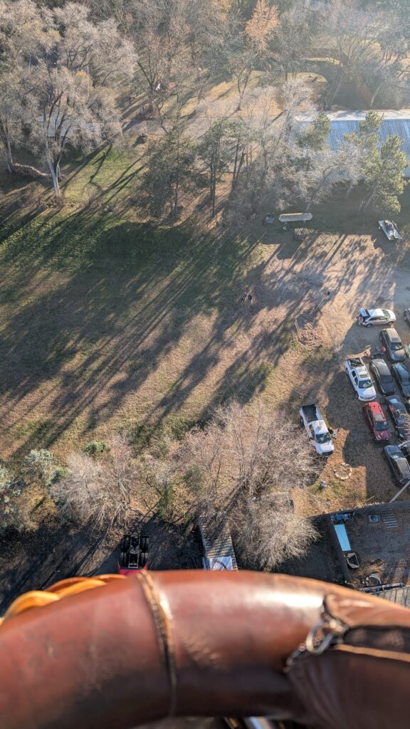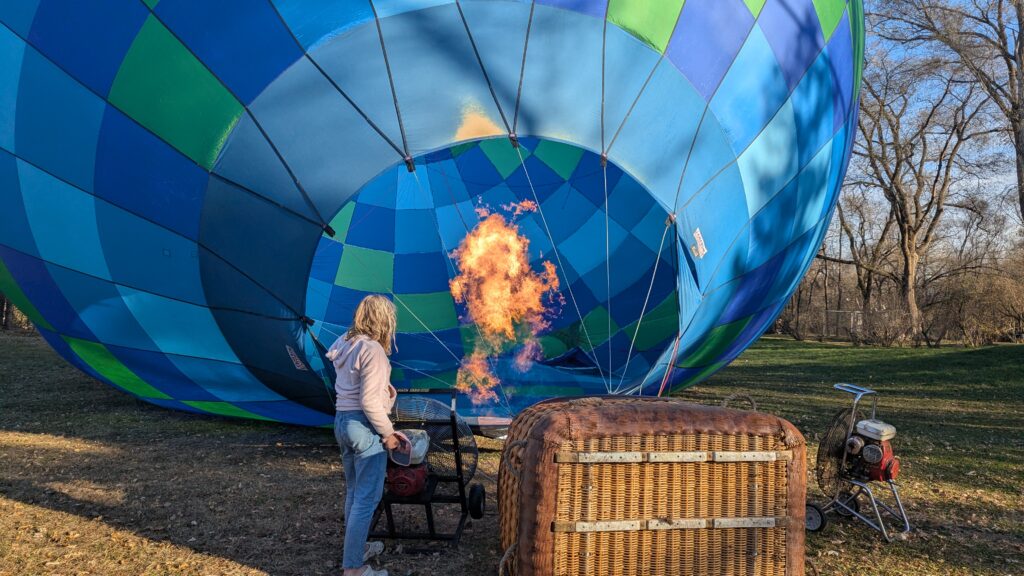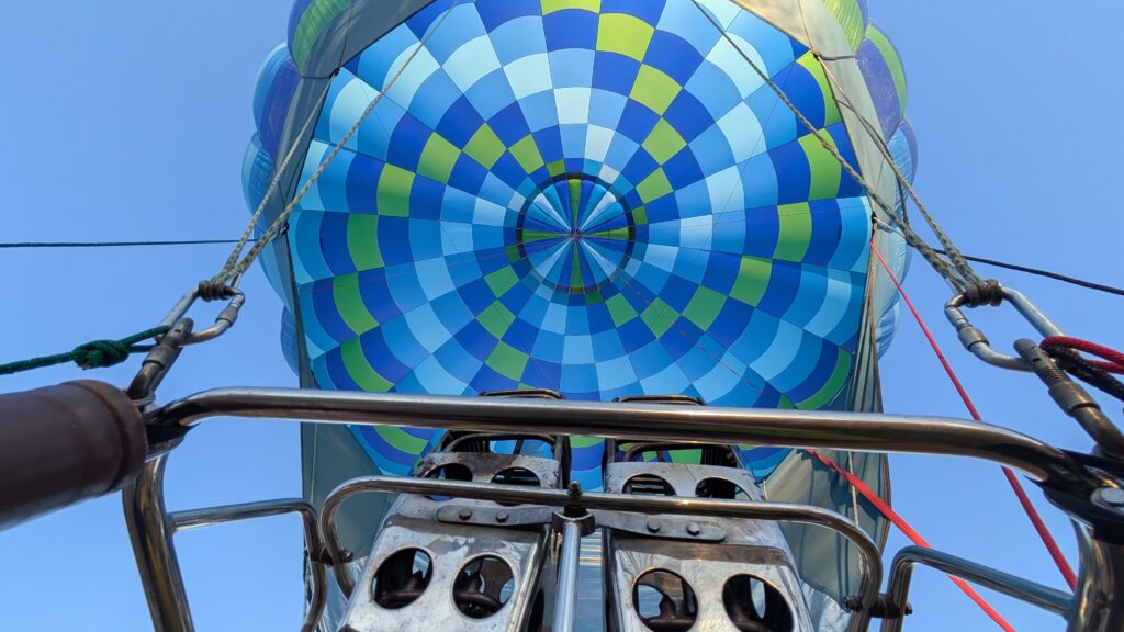 I’m not sure how to describe it. It doesn’t feel like you’re flying or even that you’re floating, hanging in a basket. It’s more like you’re just somehow in the sky. The ride is dead silent. Almost spooky. Well, that’s except when the pilot pulls on the throttle, sending flames up into the balloon. That is very loud, but then completely quiet immediately when she stops again. That is usually only seconds at a time. We got used to her occasionally pulling on it, then the loud sound, then silence again. You’d start a sentence, pause during the noise, then un-pause when it stopped. It all felt very natural the way it broke up the conversation.
