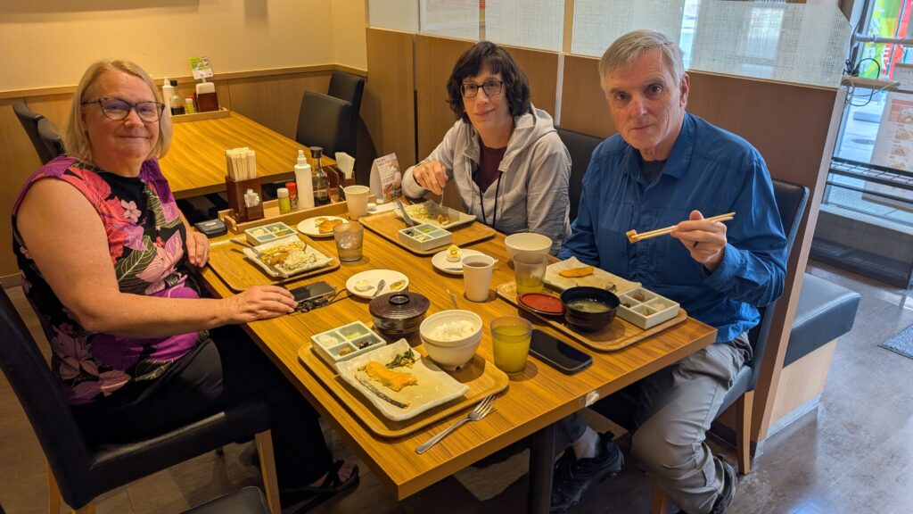 Since we didn’t use our breakfast coupons yesterday, we took Mike and Kristine to breakfast in the hotel today. Mike used his dictionary and was able to get the eggs for Kris and I cooked through. Delicious. He and Keith enjoyed using the rice machine – you set a bowl under it and push one of the buttons – a bite, a little, medium, or more. Kristine found dressing for the cabbage. Things were really getting fancy at that point.