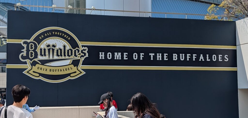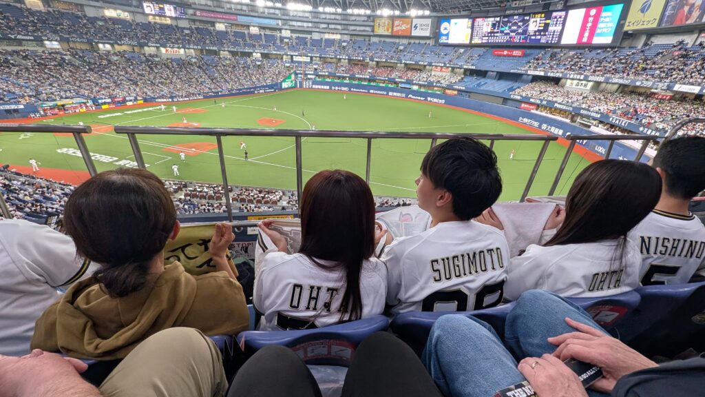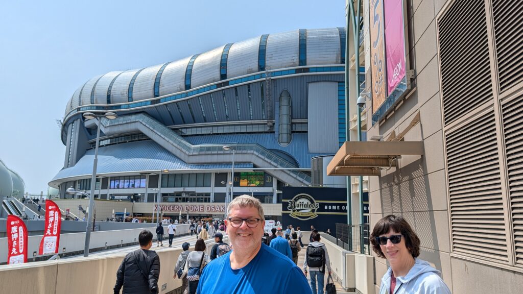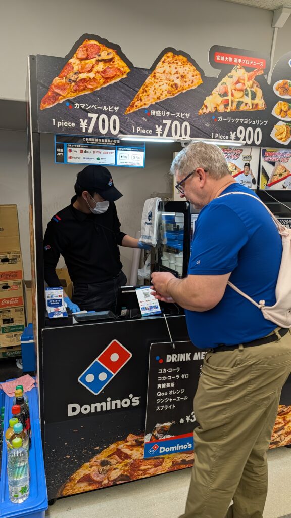 We trained to the stadium to go to a baseball game. Yesterday was opening day – just like back home. Our team, the Orix Buffaloes, lost 0-10. Sad day. I can’t help wondering if they know that “buffalo” is already plural. It’s pretty interesting to me that We got there early to experience all the things that might be happening. The first thing we did was get a slice of Dominos pizza for me. It did not taste anything like pizza from home, but I enjoyed it anyway.