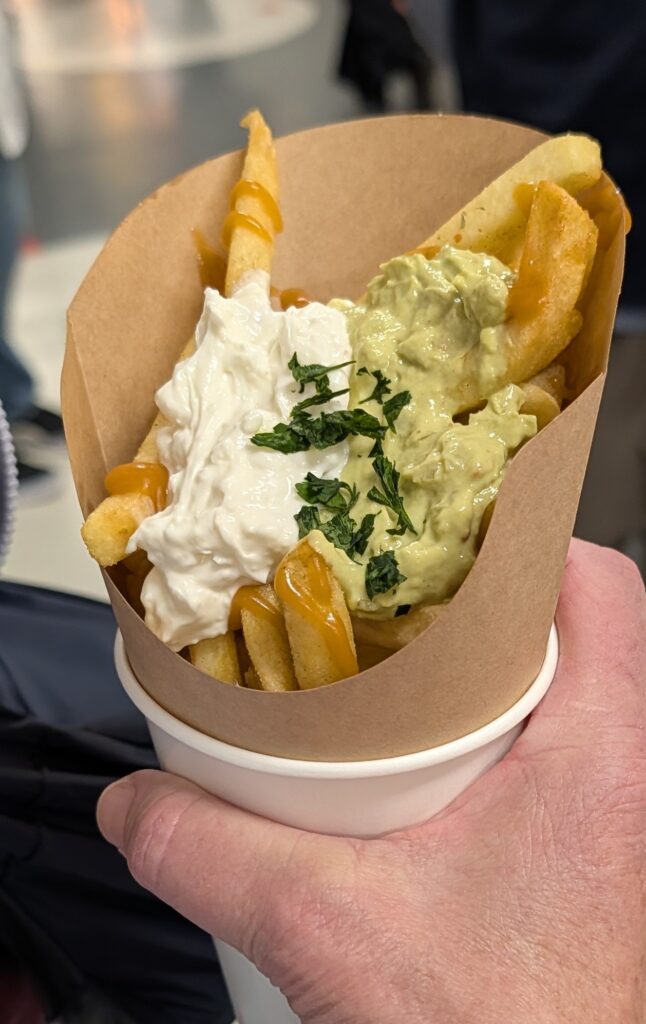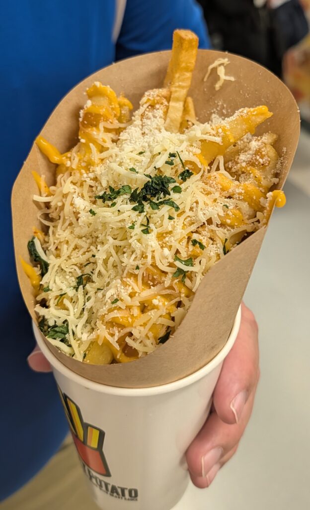 Keith and Kristine got fries from Grazy Fries (a portmanteau of gravy and crazy). “Gravy” seemed to mean toppings because there were lots of choices, but none of them were gravy. Kristine got sour cream (she did not previously know about the joy of sour cream and fries) and guacamole. She said it was good, but she didn’t need to have it again. Keith got three cheese. There was a cheese sauce, plus shredded cheddar and parmesan. The parmesan was awesome. I need to eat more good parmesan. The cheese sauce made the parmesan stick to the fries and that was great.