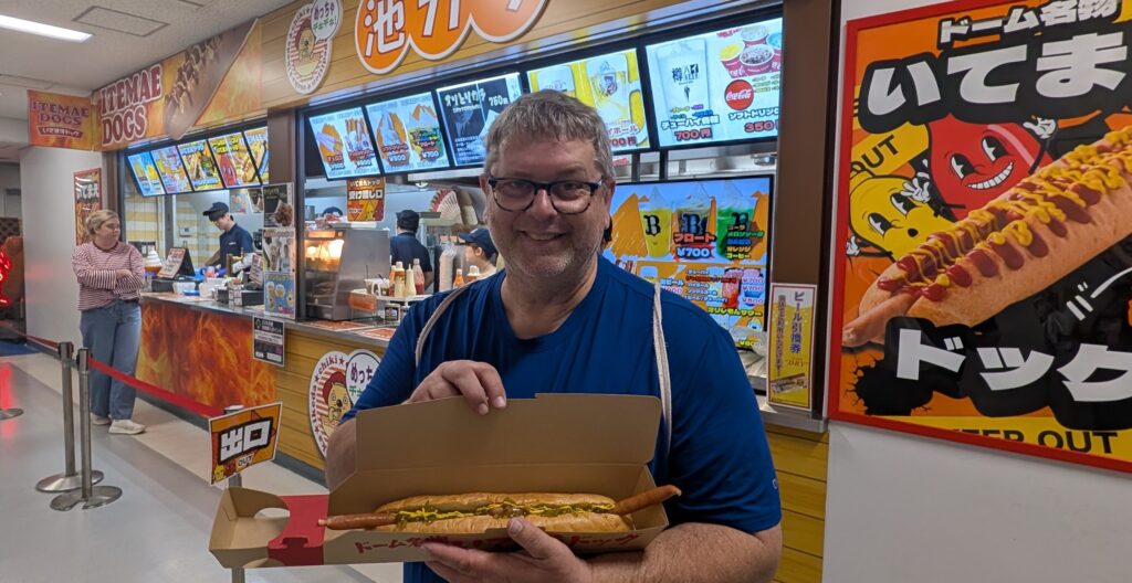 We saw that they had a 30cm hot dog. We figured that was about a foot, because of math. It seemed longer when Keith got one. The funny part (to me) was that it was actually two hot dogs in one long bun. They overlapped a little and then stuck way out of the ends. They had mustard and relish (and more) so Keith could dress it like he wanted. He said it was good.