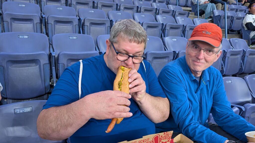 The game was great. We took an early lead with a two-run homer in the third inning. There was a stolen base, a double play, a guy got hit, the other team went through 6 pitchers (SIX), bases were loaded to end the first and second innings, there was a broken bat that almost cleared the infield, pinch runner, pinch hitter, a really wild pitch, and I’m sure more I can’t remember. The POTD is a moment after our guy hit a blooper up the third baseline, scoring two. The next guy got a hit too and the play at the plate was so close they had to look at the tape to decide if the call of out was right. We saw it on the big screen from many angles, closer and closer, and I couldn’t tell. Kristine was confident he was out. She has good eyes. They ruled him out.