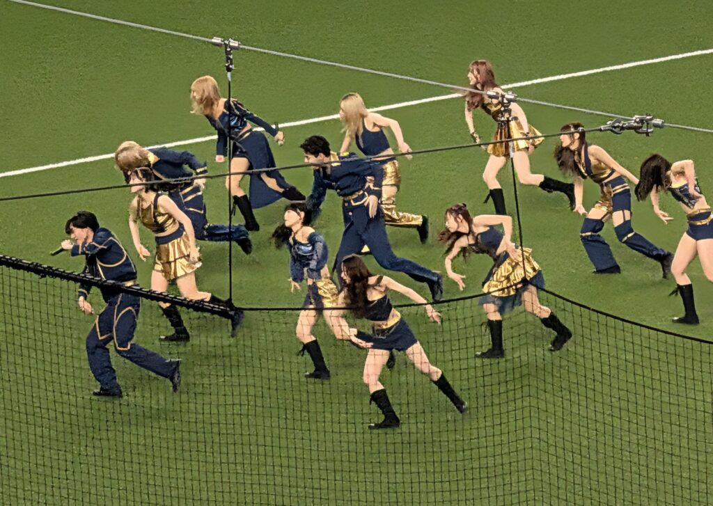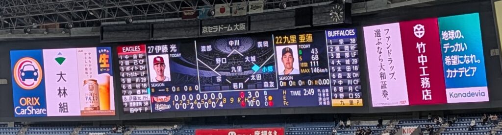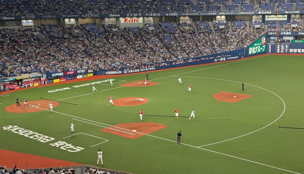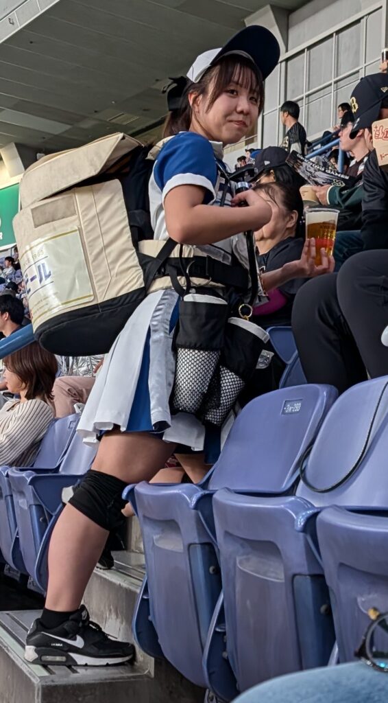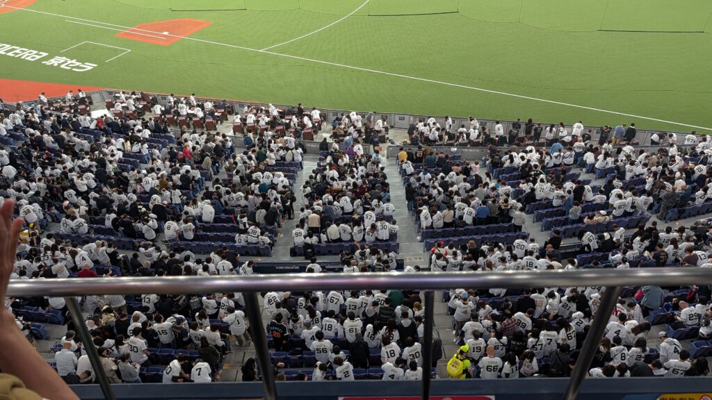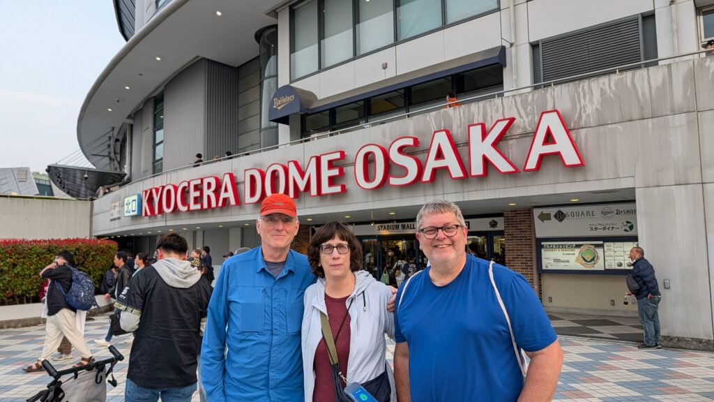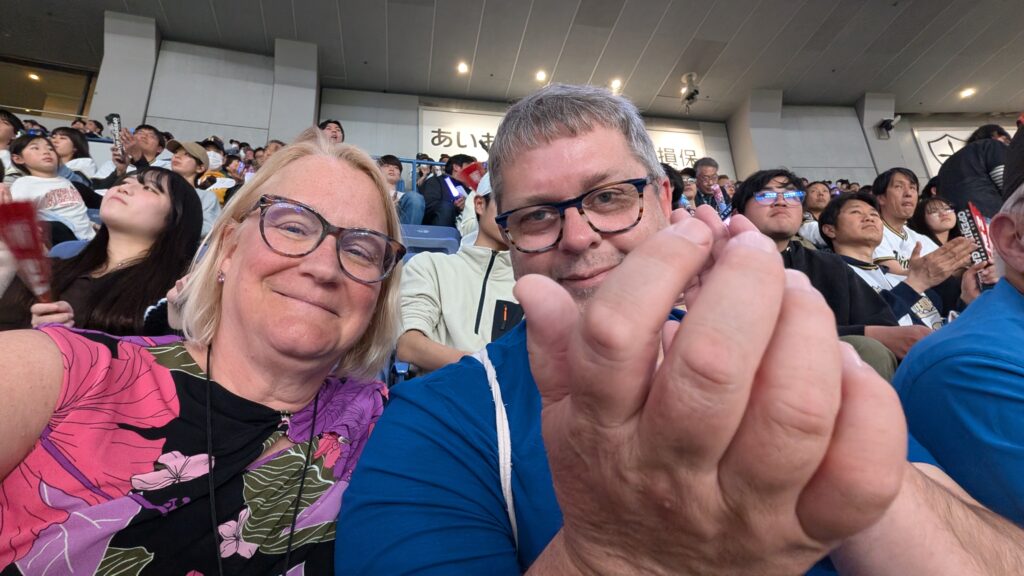 When the announcer started introducing the teams, he was speaking English. I am not sure I even noticed until Kristine asked why he was speaking English. Huh. I asked my phone why and it said that English is used to cater to the high volume of international tourists (that’s us!!) visiting Osaka. Attending a Japanese baseball game is a popular cultural activity for tourists. I’m going to give that a double huh. I mean, yes, tourists (us) probably like to go to games, and probably like that they can understand the announcing (we did), but a vast amount of the crowd was wearing team jerseys, so tourists are a drop in the bucket of the people there. I liked the jerseys and spent quite a bit of time picking out whose name would be on my jersey. Kristine said I repeated everyone’s name after the announcer and then said I liked it. I don’t seem to be very discriminate. Nakagawa had a really good game and that sounds good, but his number is 67 (six seven!) and that seems just a bit too trendy and off topic for my special, imaginary jersey. The girls in front of us had Ohta – he was definitely the cute one -(although pinch runner Watanabe (number 0!) seems like he might be the new cute guy) and was a good player, but that is so short. Anyway, it was quite interesting to me through the game.