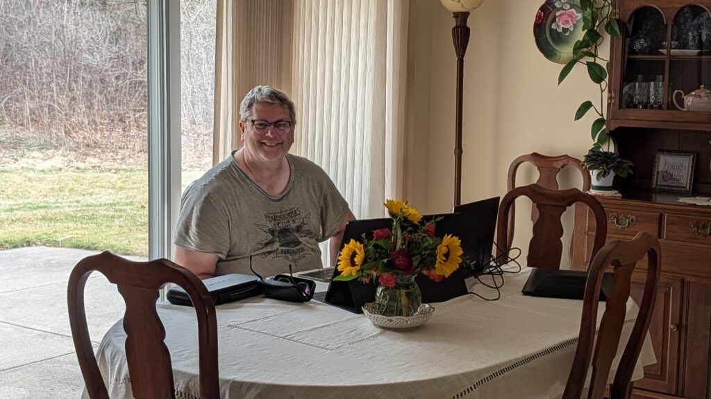 I came up this morning and Keith was all set up for work! It was like olden days! He is talking with former coworkers about a temporary/contract/full-time/part-time/? job, so I actually thought he was doing work about maybe doing work. He was arranging a song for brass band. 🙂