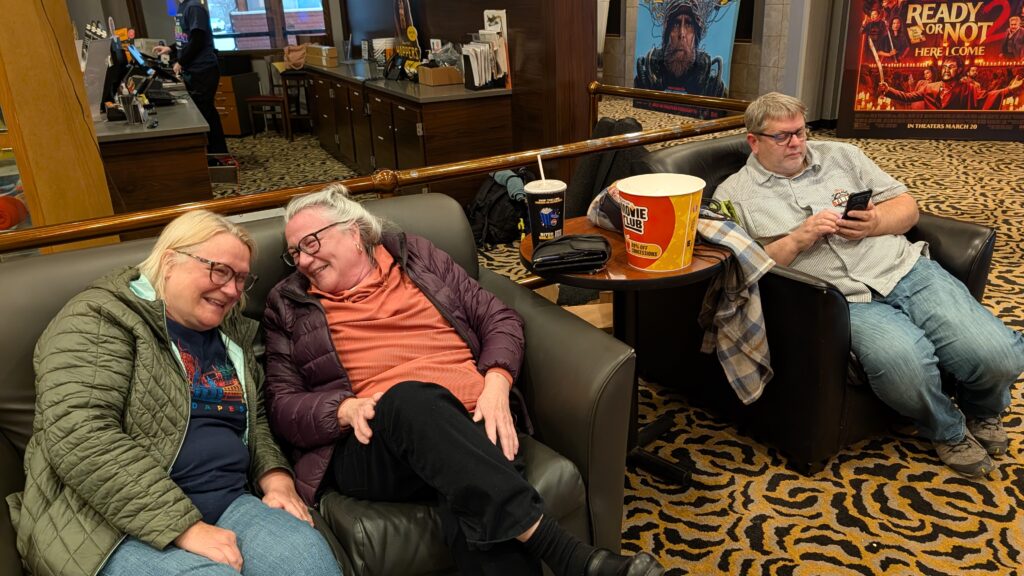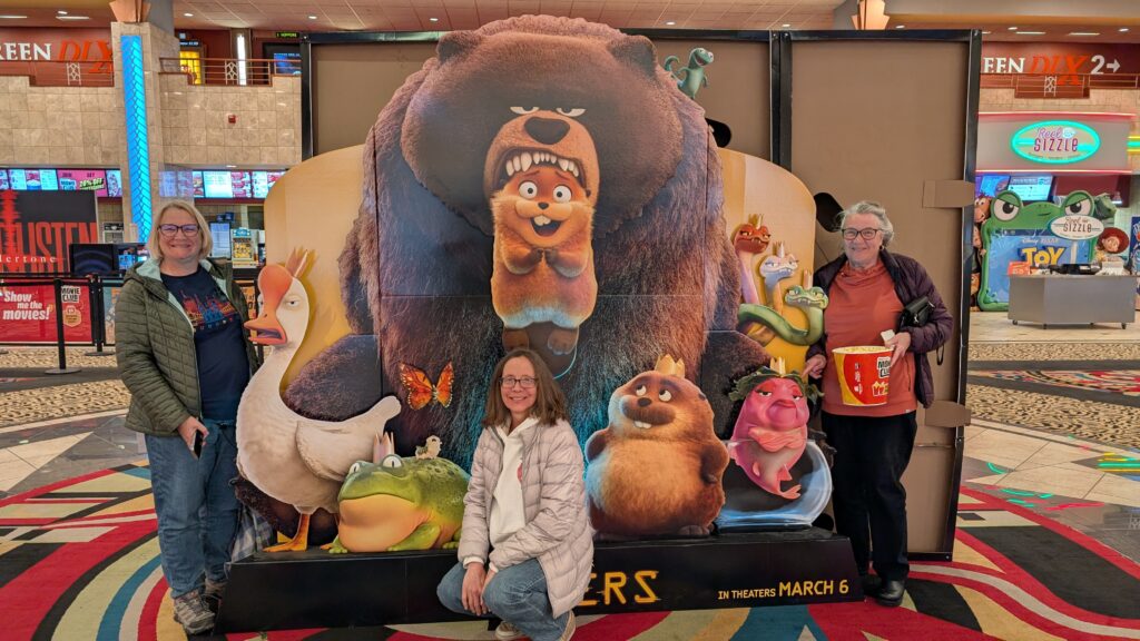 I went up a level for my GLP1 shot yesterday and today I was nauseated a lot of the afternoon. We went to see Pixar’s Hoppers. I appreciated the cold wind blowing through my open window on the ride there (big weather change from yesterday) and got it under control for most of the movie. I had a little soda after the movie and it roared back. I made everyone sit in the comfy lobby chairs for quite a while until I was sure I wouldn’t throw up in the car. When i was feeling better, we sisters had laughing while Keith pretended not to know us.