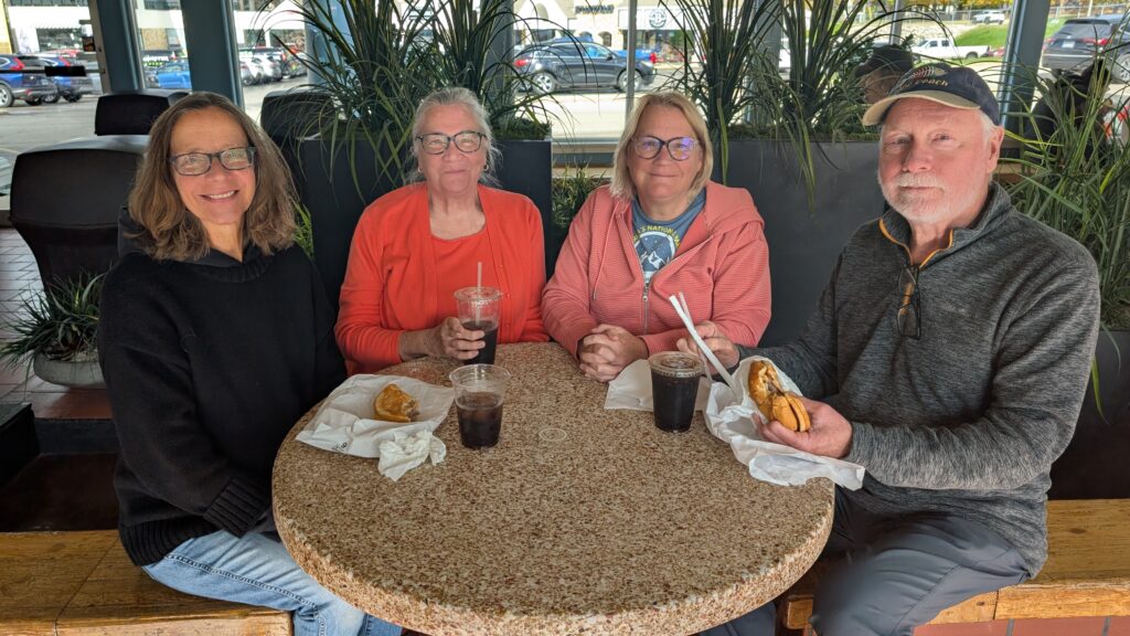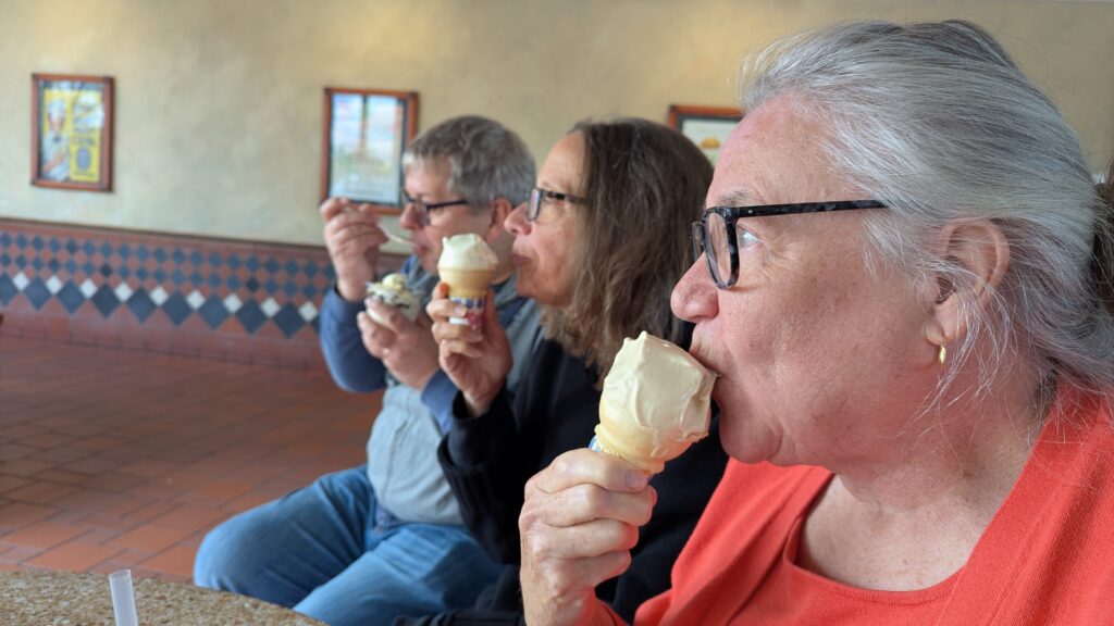 We started the day off with lunch, because I did serious sleeping in. After hamburgers that made Nancy and I make little mmm mmmm sounds while we ate, we enjoyed caramel cashew and Boston cream pie custard. We sat on the seriously uncomfortable benches until we couldn’t. We laughed and laughed.