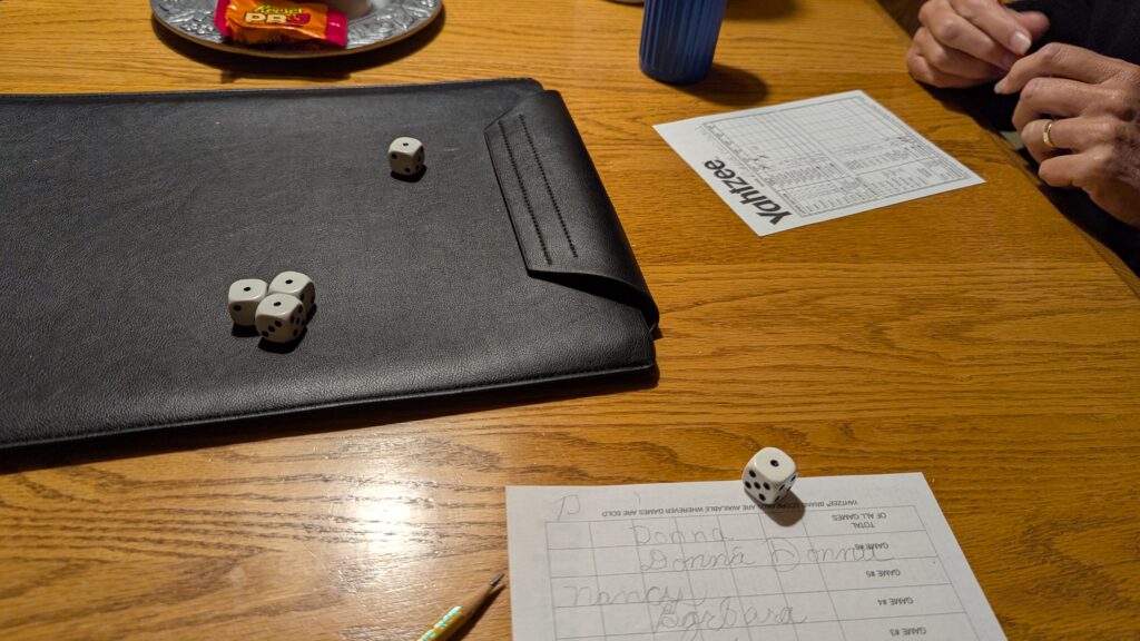Donna came over to Nancy’s. We played Yahtzee. Donna said, “I guess I’ll go for my Yahtzee.” We yelled so loudly when it happened.
