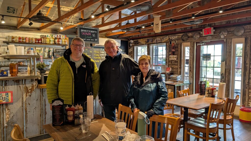 There are a gazillion restaurants here. Choosing what you would like to eat and where to get it is a little bit of a challenge. We agreed we would like to have lunch. The next step was harder. Barbara remembered seeing a place as they came into town that was Something Pig – it intrigued her. We googled and found the Gracious Pig. Reading the menu was enjoyable, so the decision was easily and quickly made. Both Keith and Barbara were enticed by the fried bologna sandwich (with pimento cheese – which according to Barbara sounds awful on a hamburger and wonderful on bologna. I was looking forward to tasting the creation). It was no longer on the menu! Oh, sadness. They pivoted to other fine choices. Barbara ordered the appetizer of smoked cauliflower. I thought (but did not say) nope, no cauliflower for me. She said she likes it lots of ways, but had never heard of/had it smoked.