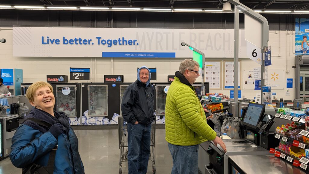 It was stupid cold here today – high of about 40. We were mostly in, but Barbara decided she would like to buy a sweatshirt to add to her layers for the next couple days. We stopped at Walmart because it was near and seemed the perfect place to get a necessity sweatshirt. Nope. It was solely a grocery store. Huh. New to us. We needed a few things and the four of us wandering around, slowly deciding what we might need reminded me of a movie interlude that the good guys take while thinking they are safe while running away from the bad guys. I don’t even know how to explain that more, but it was a very pleasant grocery store trip.