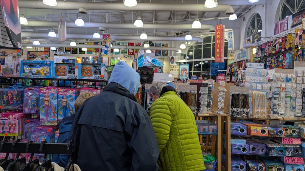 We went to a beach wear shop and immediately found the full-zip sweatshirt of requirement. Huzzah. I wandered a bit and came back to see the three of them huddled. Keith was playing a little game full of water that you push the button the try to get the rings to land on the stack. It was briefly very interesting.