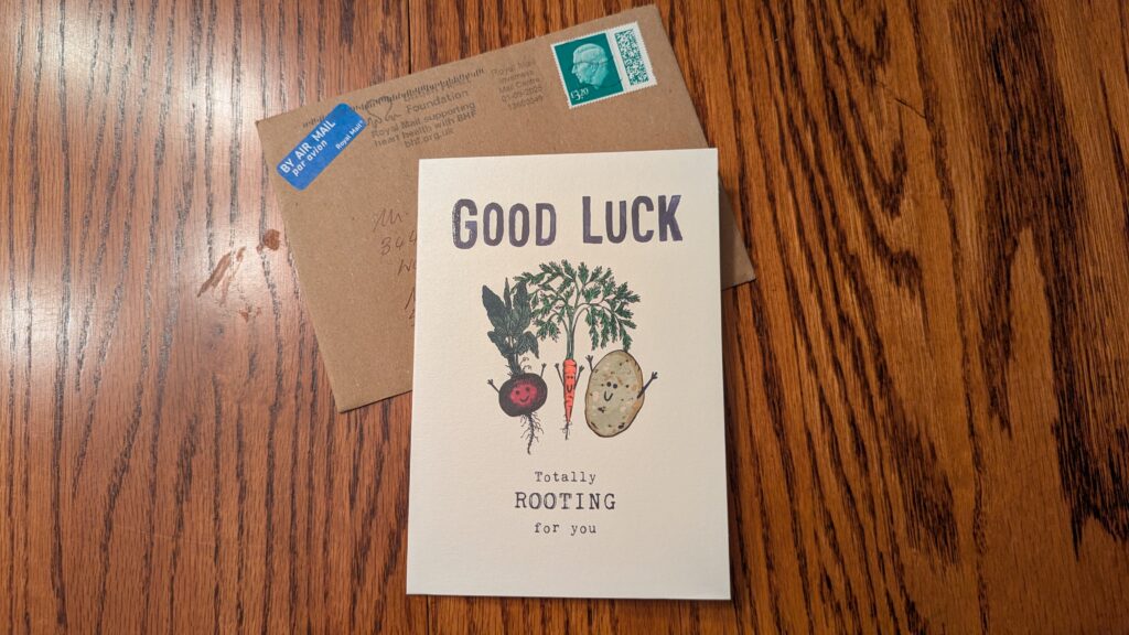 When he got the mail, he was treated to his first retirement card, or more accurately, happy new phase card – and it was from Scotland!! How great is that? Alex and Joe from the boat (recent river cruise) sent him a great card. I think the moral of the story here is, when in doubt, send a card. The receiver will be delighted.
