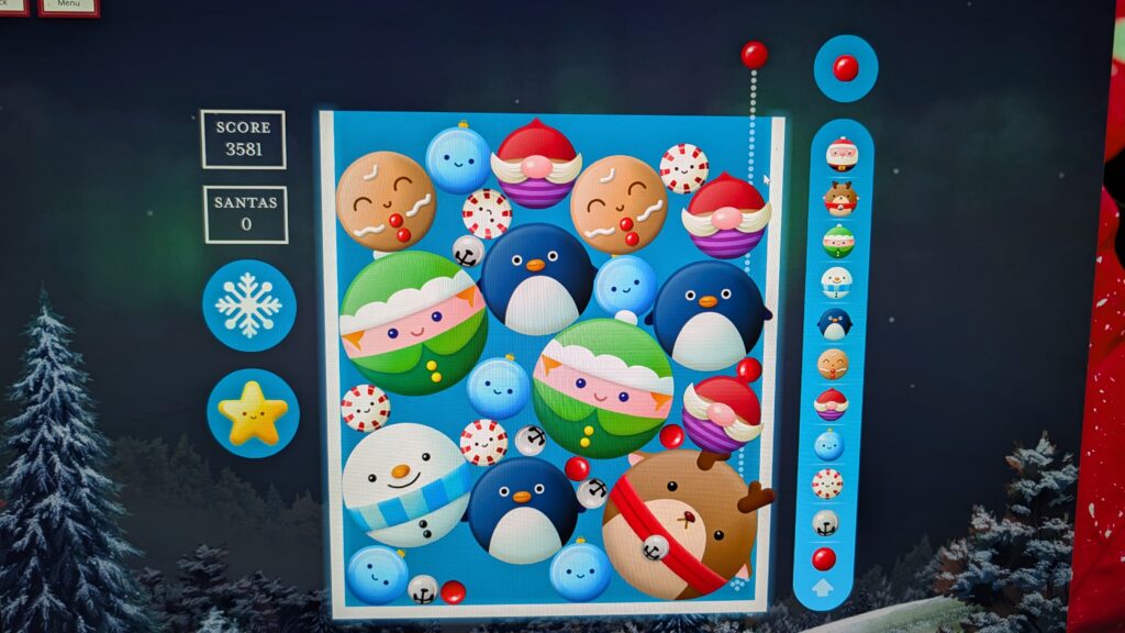 I’ve been busy with working the past two weeks. Keith had a gig tonight, so I was home alone. I could have done laundry. I could have cleaned up our bedroom. I could have done a lot of things. I played this Christmasy version of the watermelon game. A lot of times. I was trying to get a Santa. When I did get a Santa, I had to play again to try to get a Santa again.