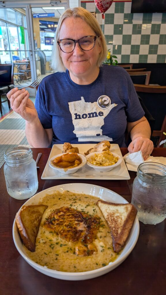 Sumpter was the town for lunch. We stopped in an Arby’s parking lot on the edge of town and looked at our phones. I said we should follow Mike and Mary’s rule to never eat in a chain restaurant on a road trip. We read a lot of good menus and decided on Jeffrey Lampkin’s Country Boy Kitchen. When we got there, it was empty. Um. That is not encouraging. We sat down and read the menu. It had names of things – I eventually chose the Harriet – with no descriptions. Keith cleverly picked the salmon and gouda grits – to be different from the usual shrimp and grits that he loves so much. A couple takeout people came. Two single men came. We waited a while. Finally out food came. Keith took one bite and said wow. Another bite. WOW. These might be the best grits I’ve ever had. He continued alternating that statement with mmm mmmm throughout the meal until he scraped every morsel of food from the bowl. My food was very good, too!