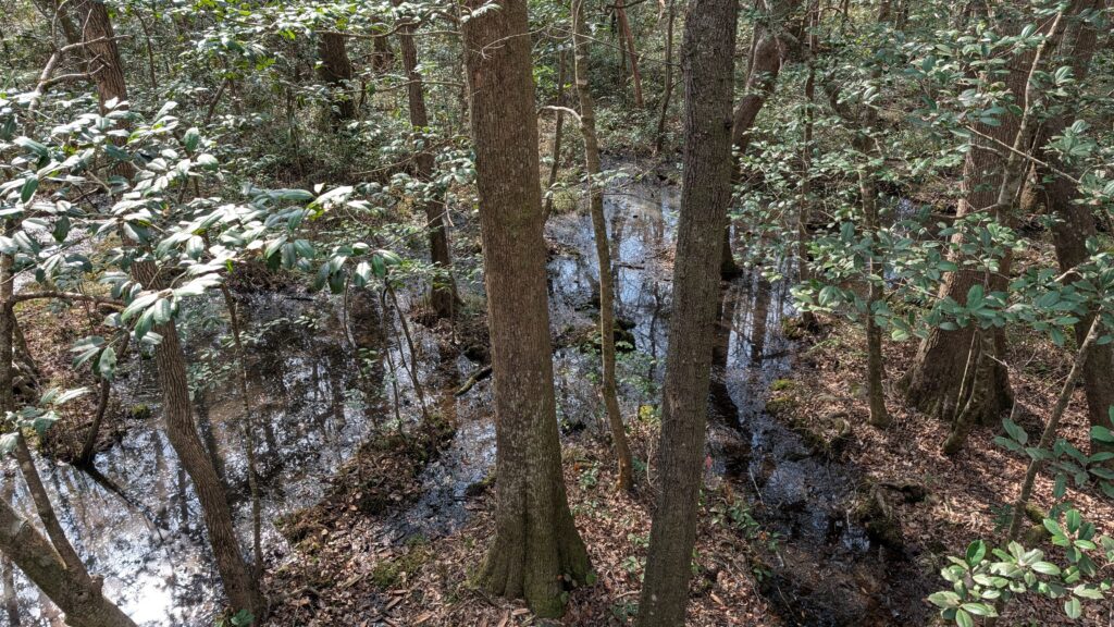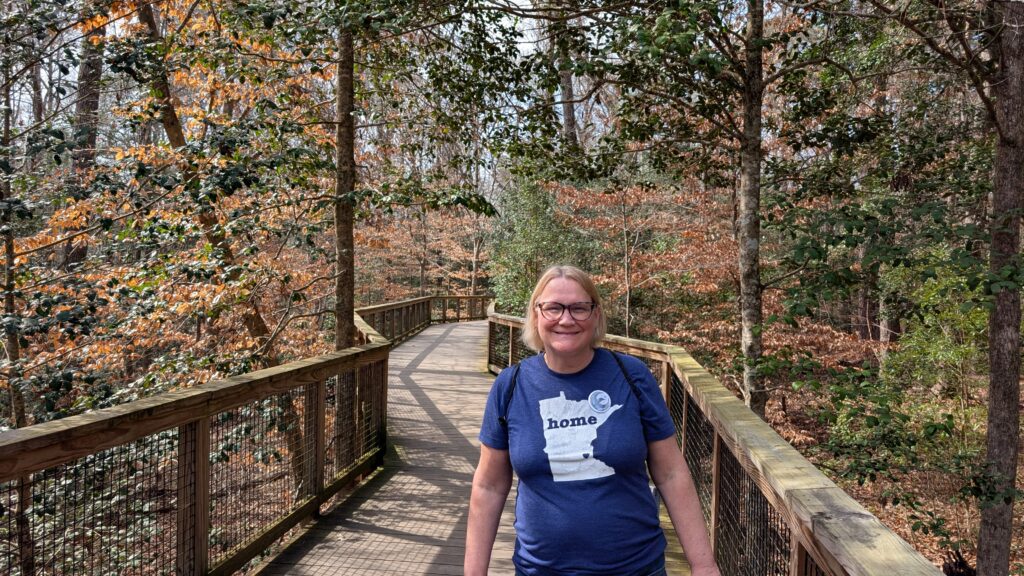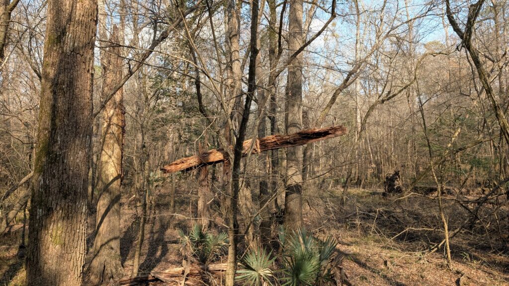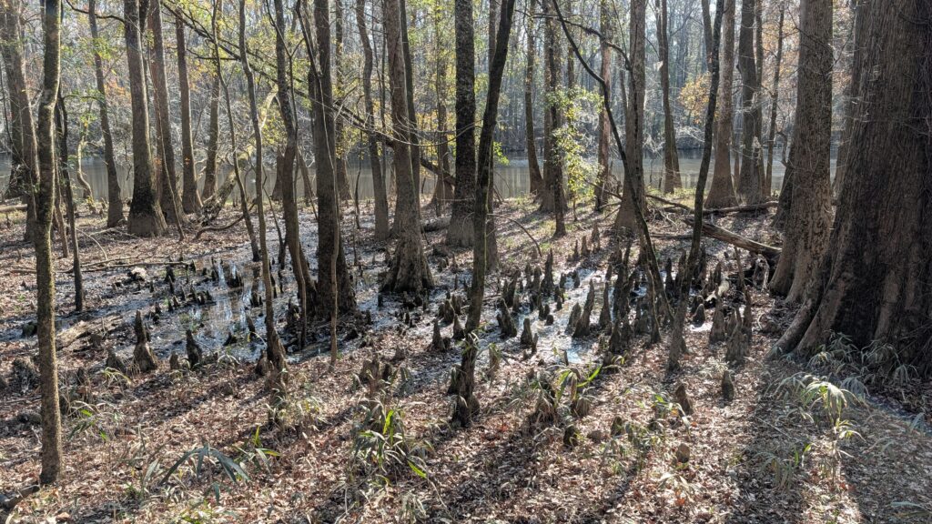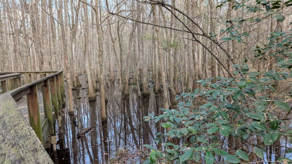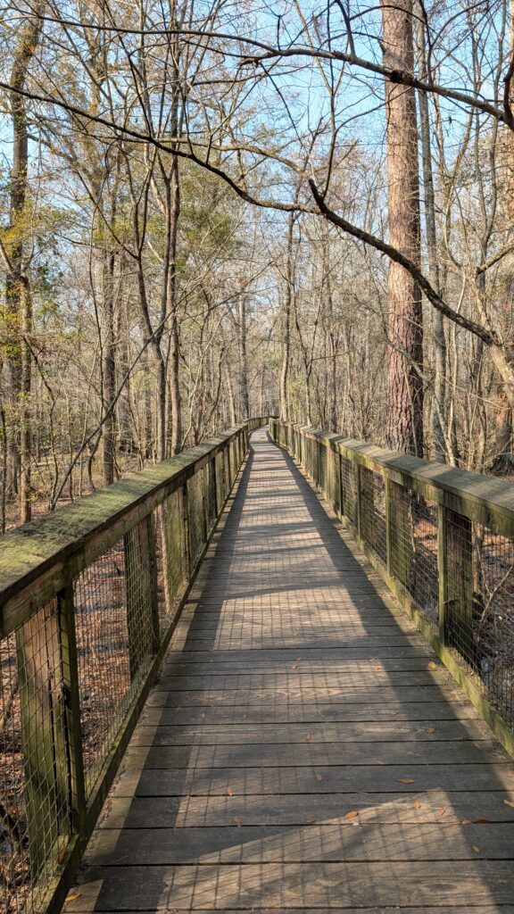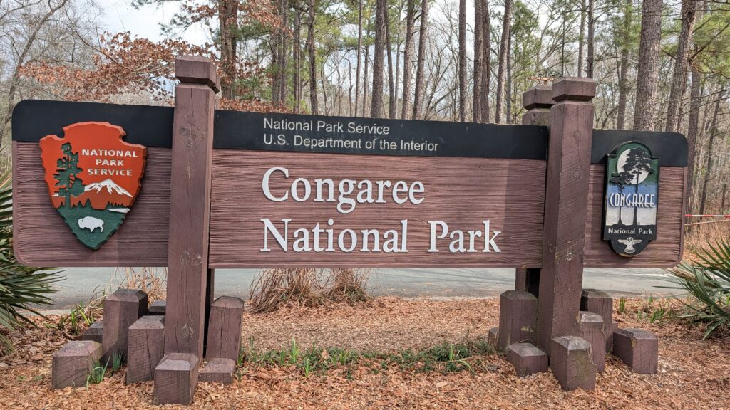 Congaree is a relatively small national park. I had never heard of it before we tried planning an eastern road trip in 2021. We figured since we had gone west and seen amaaaaazing parks in Utah and Arizona the previous year, we would do east parks next. We ended up just going to DC and back, so no Congaree. It is three hours (because they are little roads with a fair number of stops and a fair amount of traffic. Until you get to nowhere, then you are just kinda going on your own on bumpy roads). It is an old growth forest with the tallest trees in the east (you just kinda think hey people – you got nothing on redwoods, but they did say east, so you are, like, okay. There is something important about being in a flood plain. The whole thing floods every year – feet and feet of water and the trees are okay with it. The whole place was trees, and trees, and trees.