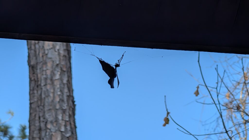 I saw a leaf stuff in a web or something on the way out. I thought it looked like a hummingbird.