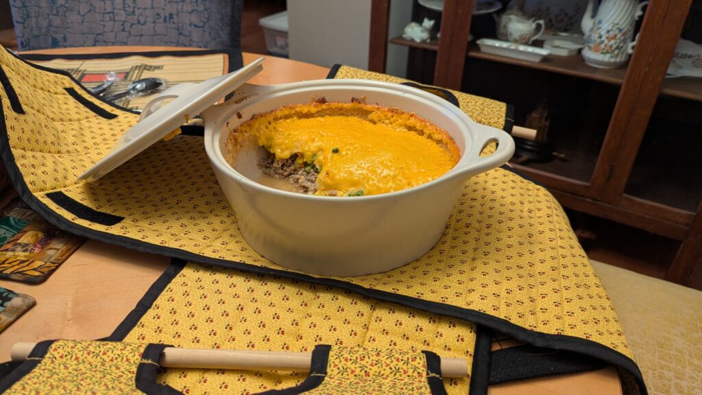 Susan and Peter Wickert made us cottage pie! What a delightful homemade meal in a fun carrier that helped keep it warm. It was so appreciated, and we ate it right up.