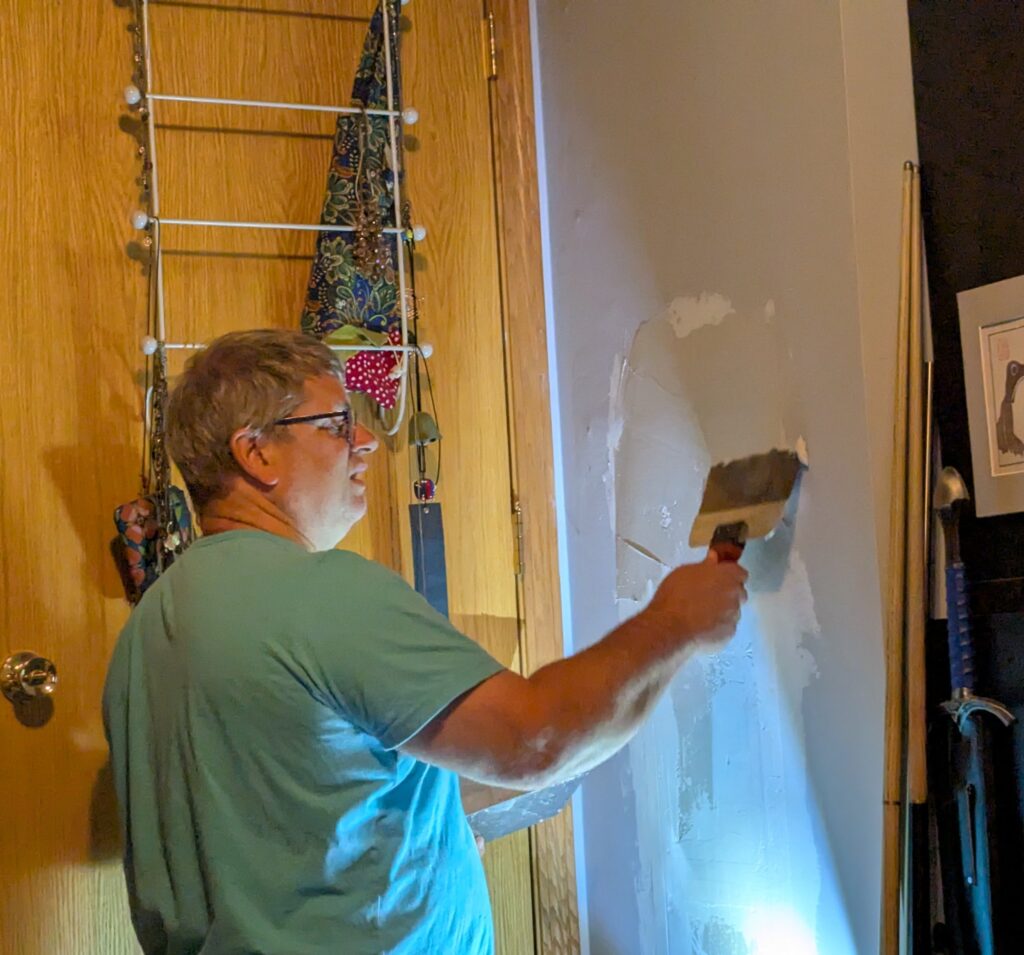 I took this picture when I woke up this morning – Keith mudding drywall. He is fixing the hole he made behind Benjin’s bedroom door while fixing the plumbing in March. That is why we have come to the south.