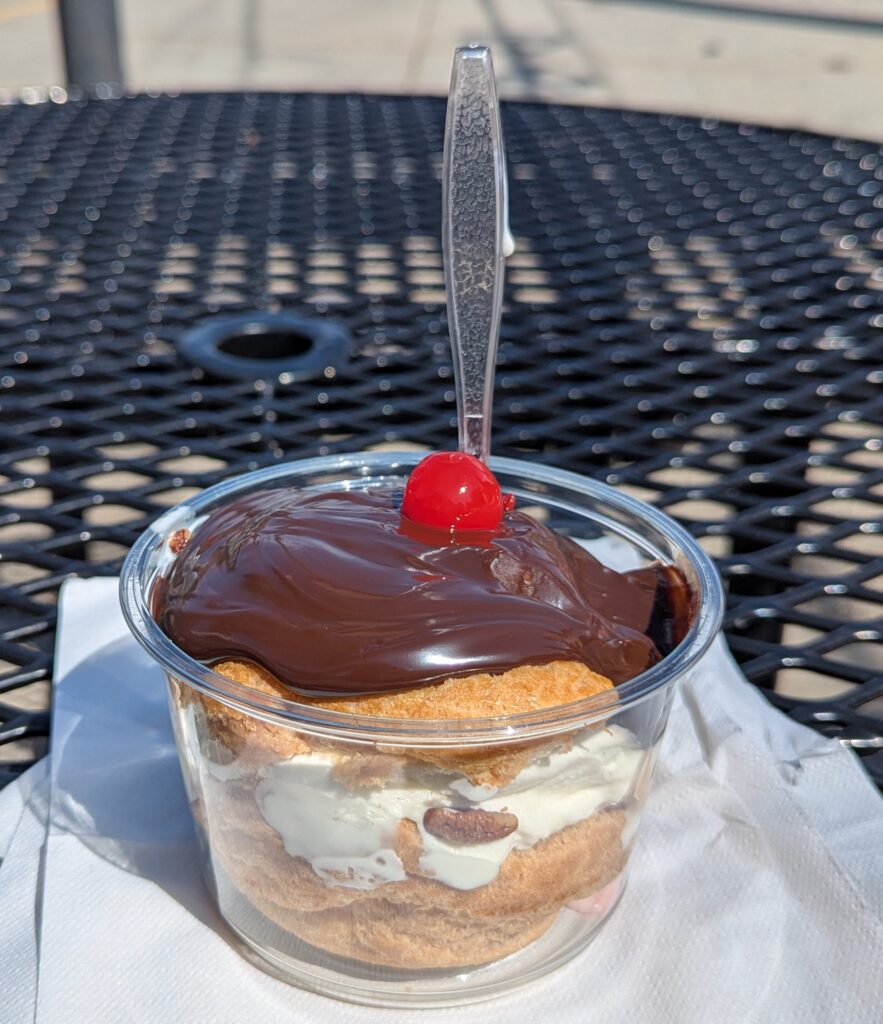 We headed for Nancy’s house after lunch and visiting with Benjin. Keith had the awesome idea to stop for custard before we got there. I pulled up the website to check the flavor of the day (banana pecan) and saw that they have something called a Custard Puff Sundae. OoOoOoOoO! I had it with banana pecan and it was SO good.