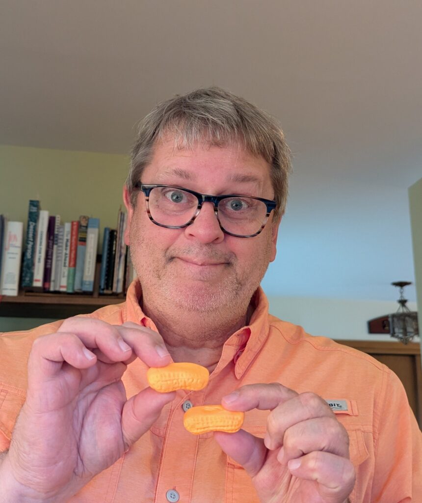 Dennis brought Circus Peanuts. I think it is the greatest texture of food. Nancy thinks they are weird. I texted Alexander this picture and he instantly responded, “But why, though?” He hates them.