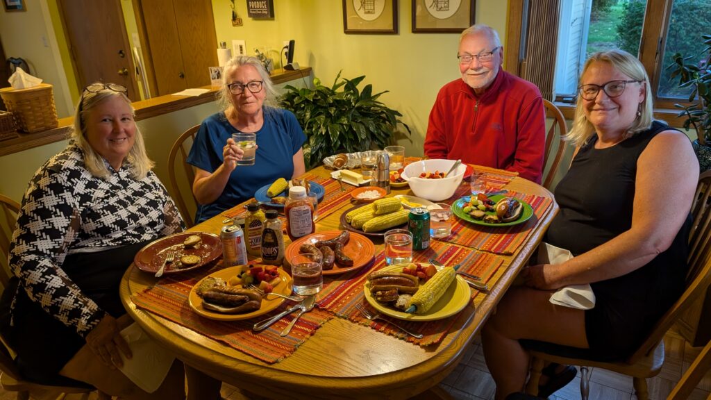 Dennis and Karen came for dinner, which was fabulous. We had corn on the cob, jalapeno cheddar brats with pretzel buns, fruit salad, and circle potatoes – with cookies for dessert. I said it was just a whole table of favorites or mine and it could be my birthday dinner – it was so perfect.