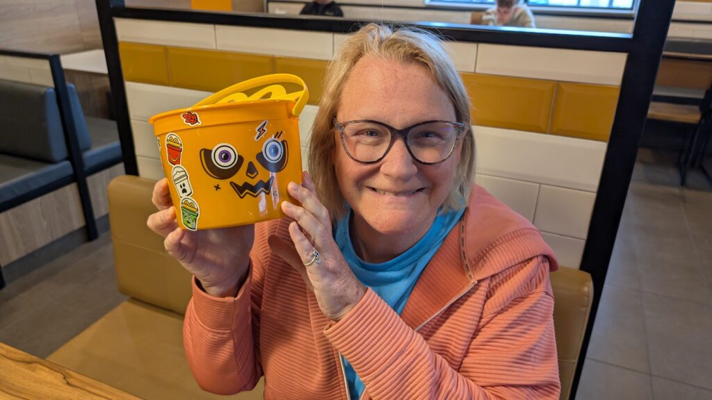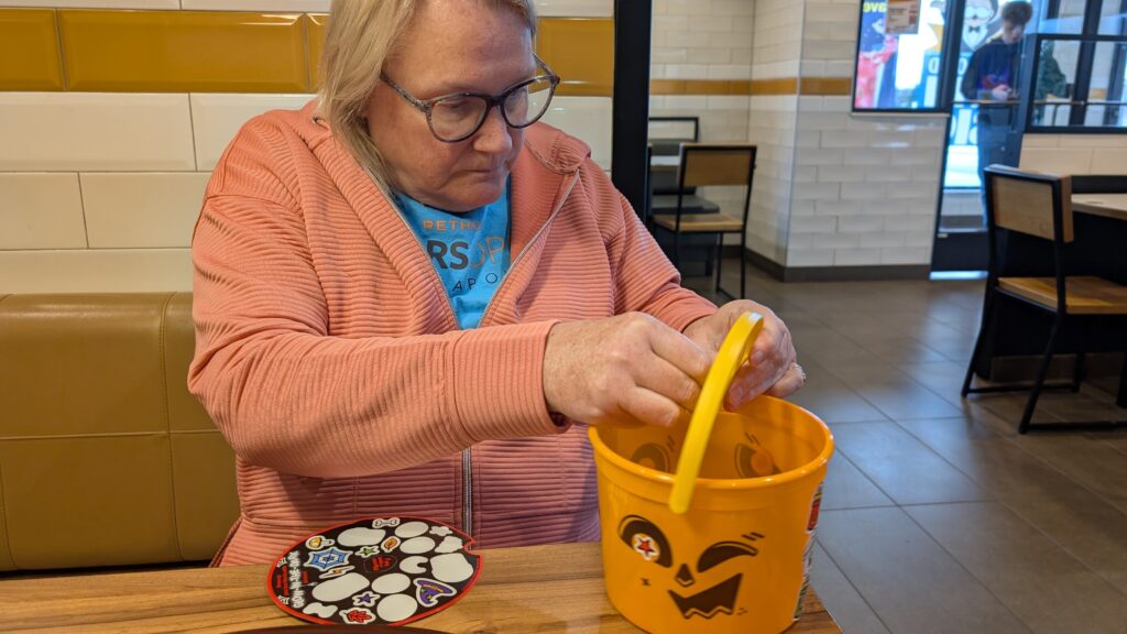 We are on vacation to Wisconsin. I remembered McDonald’s Boo Buckets started today, so did a happy meal stop instead of a rest area. It was delightful. There were stickers.