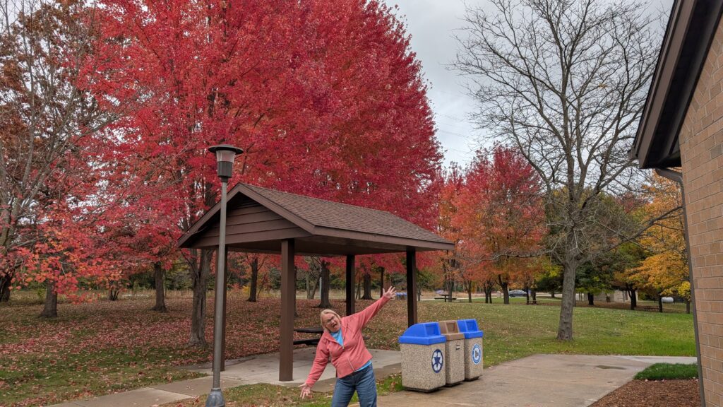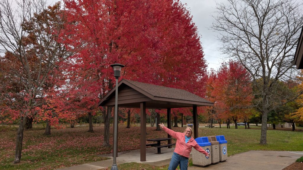 After our three big cups of diet Dr. Pepper, we did a rest area stop, too! The trees were so beautiful all the way down – they would have been spectacular with some sun. We had drizzly rain and a dark gray sky the whole day. I did some fancy posing at the rest area.
