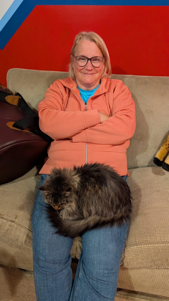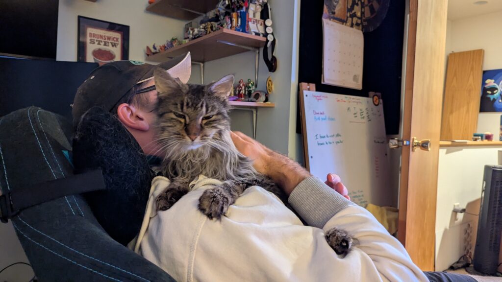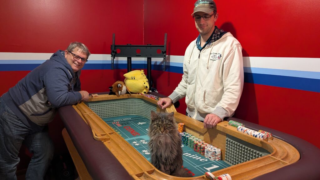 Kitty Eggs has been sick and is mostly interested in being cuddled by Benjin. Dealing craps did not exempt Benjin at all. He spent most of the time cuddling with one arm and dealing with the other. I snuggled Eggs a bit so he could get a break. It is never bad to snuggle a kitty. Keith played with us long enough to lose his $100. All fun when it is pretend money.