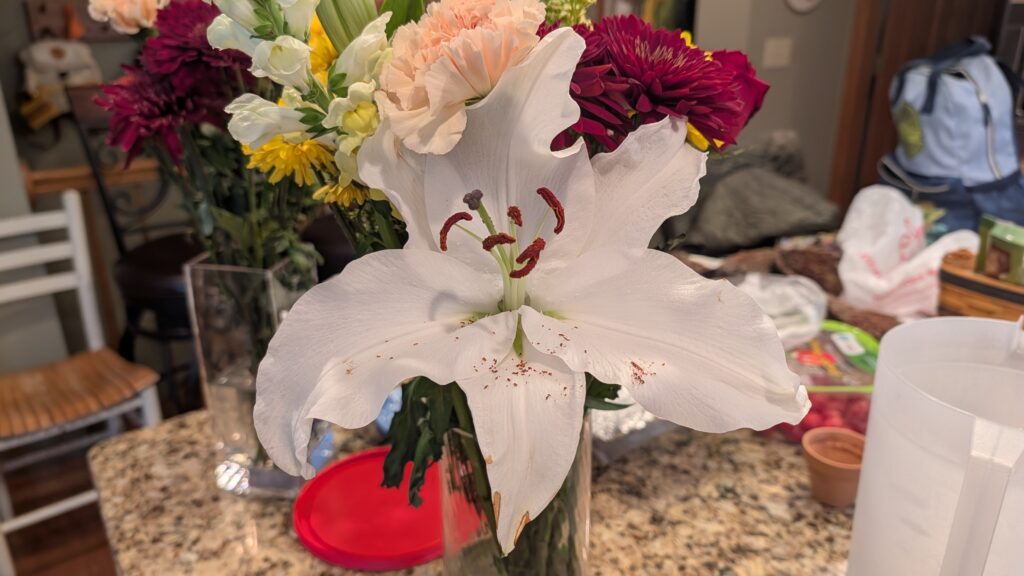 Donna brought a beautiful bouquet of flowers on Thanksgiving, and they have been thriving. It was enough flowers to fill two vases. There were several lilies in the group, and they have slowly bloomed. It smells like Easter at our house, and it is wonderful.