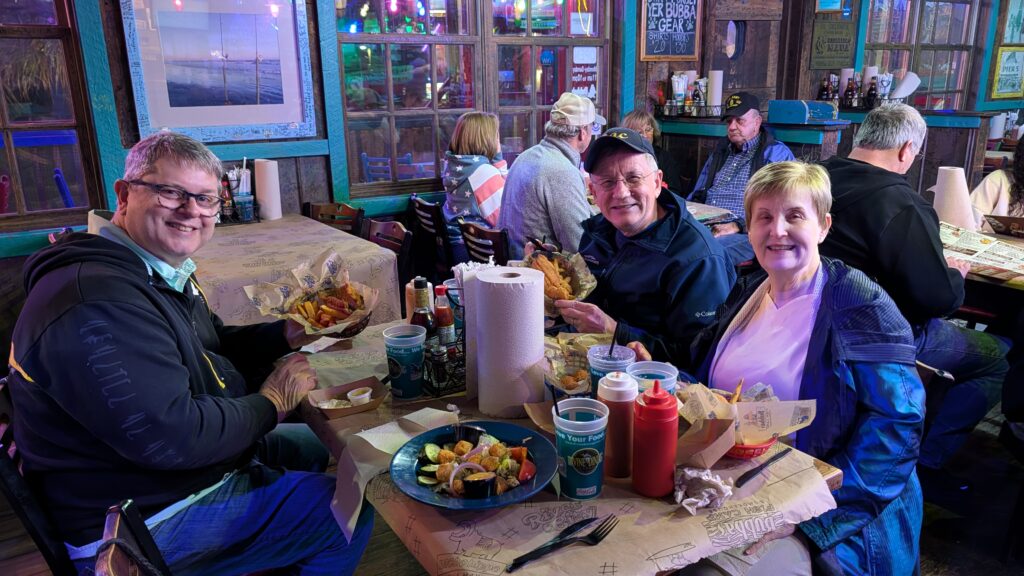 Jerry and Barbara came! We went out for dinner, and everyone (but me) had fried Flounder. Like Ariel’s friend? Yes, like Ariel’s friend (but real-life flounder are really not cute, not yellow and blue, almost not 3-D).