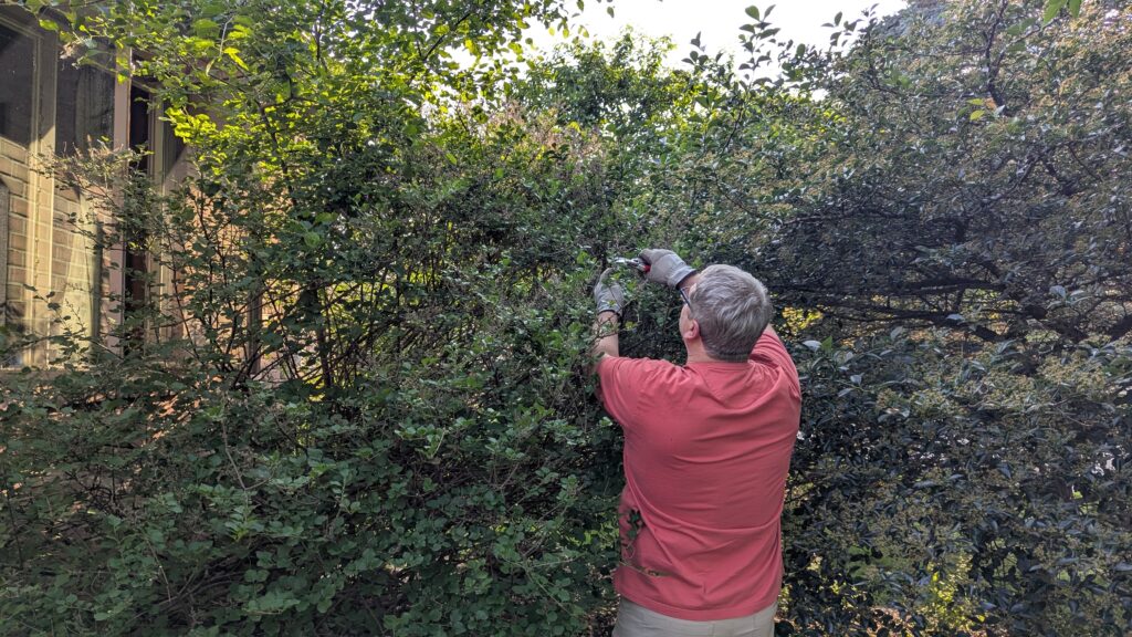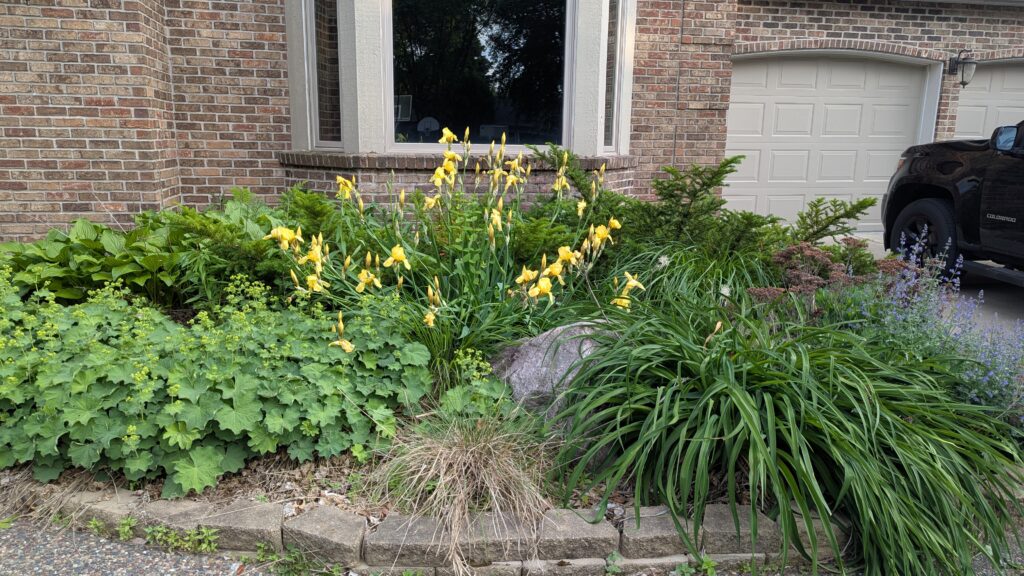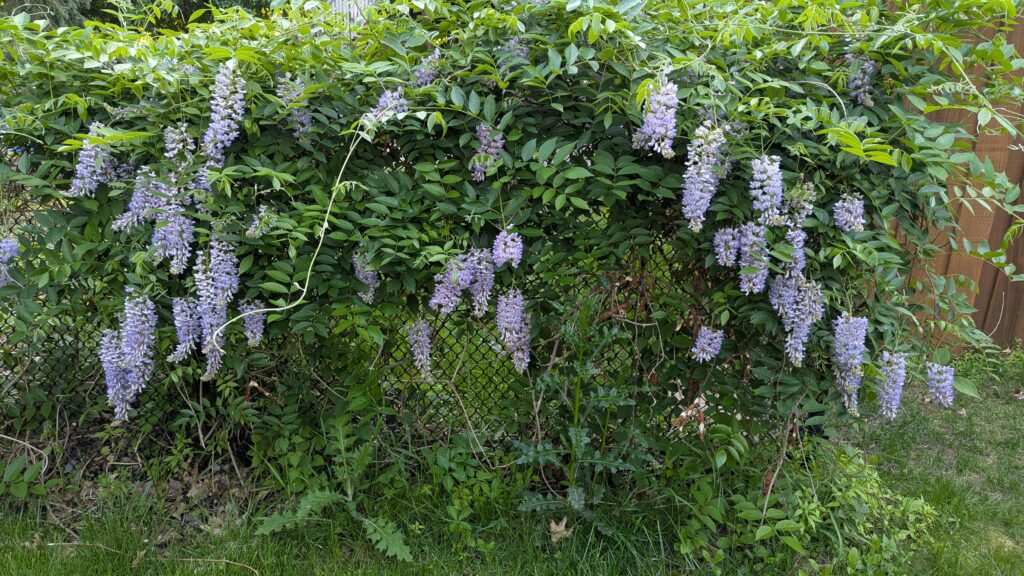 Today’s potd is of flowers formerly ours. This wisteria vine is in our old yard, but the flowers must like the morning sun, because they are mostly on the neighbors’ (us now) side of the fence. I am enjoying them greatly. My friend, Betsy, gave me some yellow iris a few years ago and they are going great in several places. I went to visit them while I was supposed to be pruning the lilacs. Pruning is not really very fun.