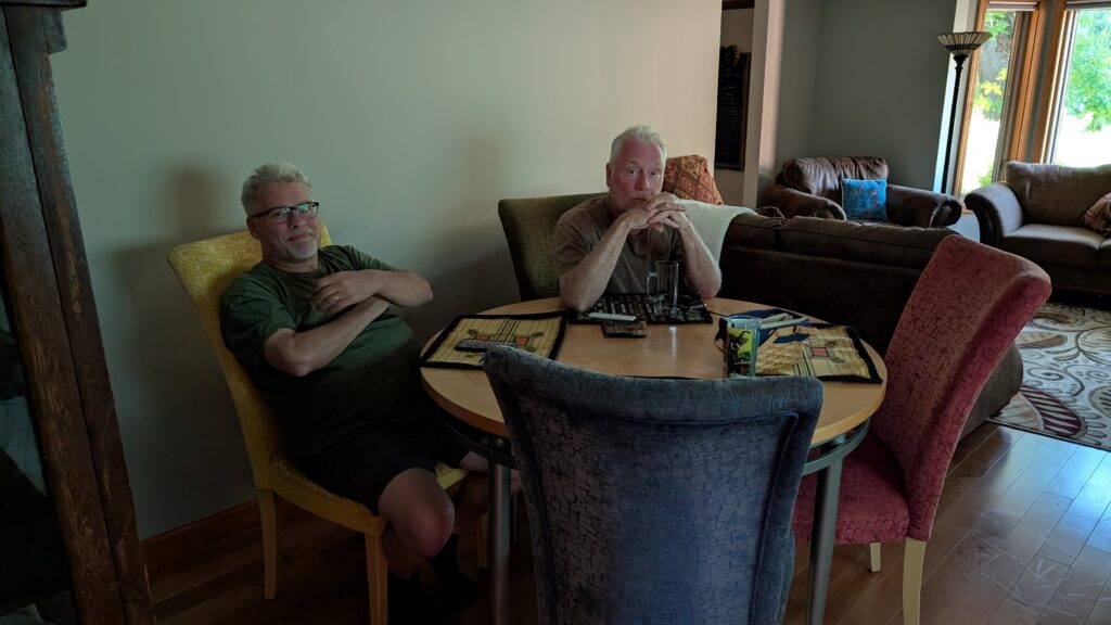 After floating this afternoon, there was college football. Apparently, you can watch college football games even if you don’t care who wins. Very interesting. People (David and Michael) can watch just for the football itself. It was fun when they exploded at the same the time: Nooooo! Auuuughhh! Yessss!. Did you see that? I was inside and outside (it got cool enough for me to enjoy a blanket while reading on the deck) (fabulous) and they just kept watching. It was very different. I slept on the couch and they finished the last game. David said he could probably find another game somewhere, but instead we all went to bed.