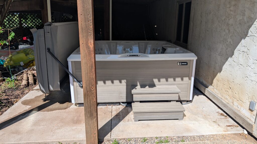 I pulled weeds outside in the 85-degree heat until they started bringing parts over. I was done with the hot and obviously had to run away (just like I did when the original guys brought it) and hide because making people do physical labor for me just weirds me out to no end. It really didn’t take long. They really knew what they were doing. It is temporarily on the pavers in back – not the right place for it, but it is all we had. There is no electricity for it yet either, so it’s not very fun right now.