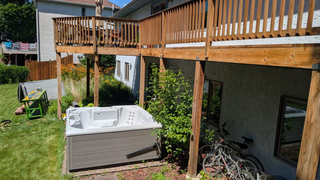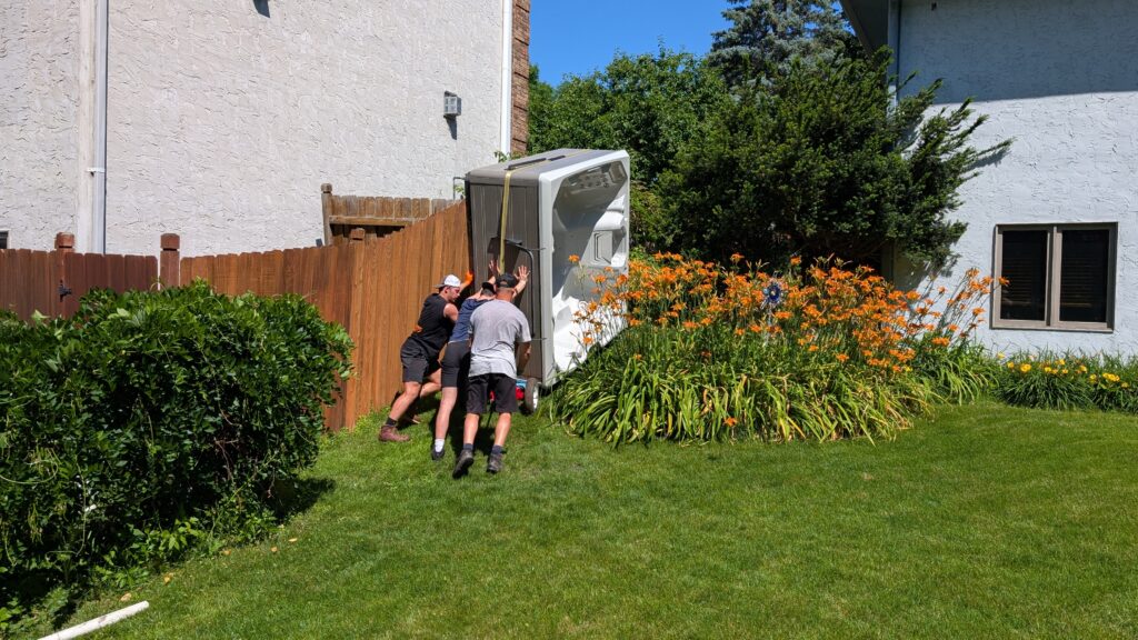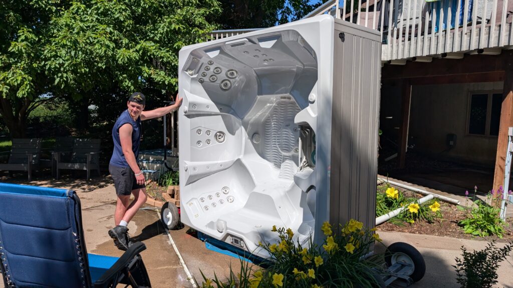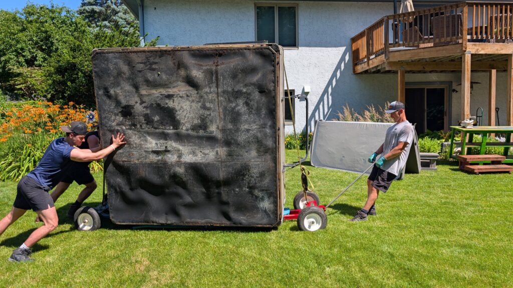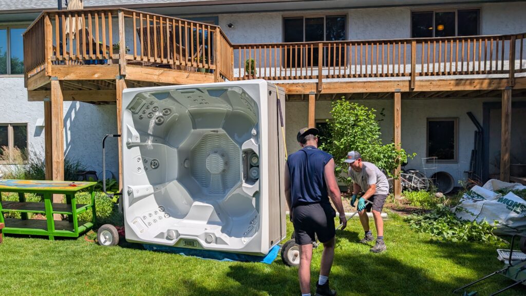 The hot tub came over today. We started with the idea that we would leave it next door until Rob and Maren were ready to move theirs over from their old house. Since they are not selling but renting, we had no definite timeline. Then we got over here and where to put the hot tub was a new game for us. We might want to expand the deck; we might want a roof over the hot tub (like we had); we might not want a hot tub anymore (okay, not really, but I did think we should think about it). Since there were so many thoughts to have and decisions to make, we just blocked it out of our minds and forgot about it. Until last Friday. The renter lady (who initially wanted to buy their hot tub) said she wouldn’t move in July 1 if the hot tub was still there (empty, covered, and unplugged). Ooookaaaay. Rob organized some guys to move both of the hot tubs today.