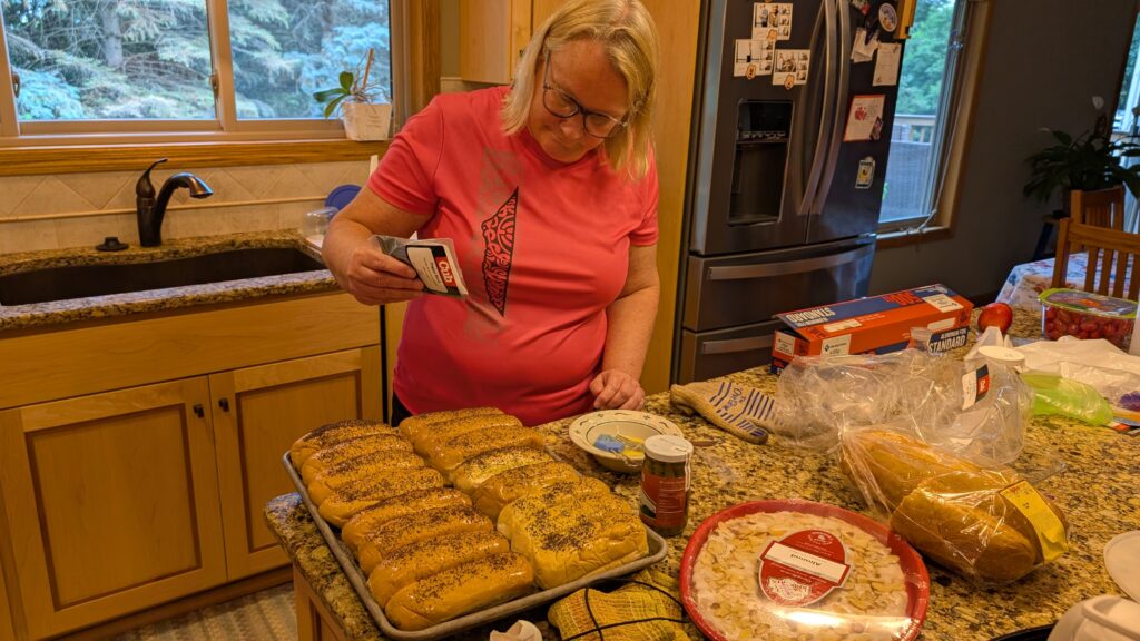 We are having Chicago dogs tomorrow – well, any kind of hot dog a person might want to have. I have ketchup, mustard, sweet relish, chopped onion, caramelized onions, celery salt, tomatoes, dill pickle spears, sport peppers, chili, cheese sauce, macaroni and cheese, and shredded cheese. The thing I did NOT have was poppy seed buns. Keith and I spent more than half an hour searching for poppy seed buns via the internet and the phone yesterday. They are important to the Chicago dog creation. We finally figured out that we had to make our own! I read a bunch of recipes and decided we could do it. Yay us! I was checking the recipe online one last time to make sure what kind of yeast was recommended when I hit the wrong recipe. The one that popped up said buy buns, wash them with egg, sprinkle poppy seeds, bake for 5 minutes.
