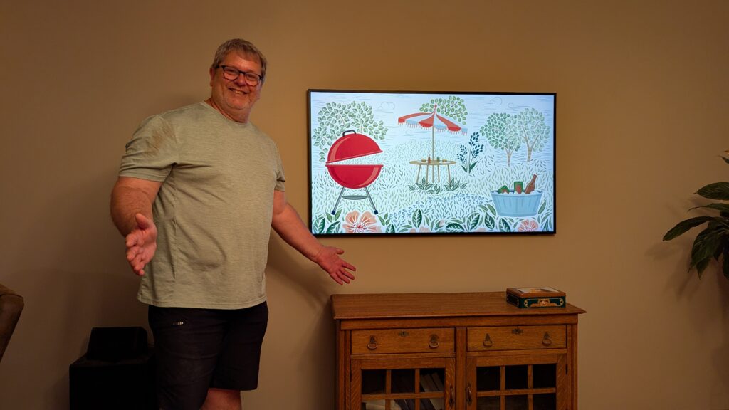 I was putting up the mounting brackets for the TV. It’s a Samsung FrameTV, designed to look like art on the wall when turned off (and it does–I think it’s pretty cool, although Alexander keeps reminding me that it’s just a screensaver, but part of it is the soft matte screen and the art collection). Part of the effect is that it’s extremely thin and mounts very close to the wall with thin mounting brackets that set into the back of the TV. You can also buy frames for it (from Samsung and others) or make your own. There is a separate box (maybe 12x3x4 inches) that is in the cabinet below it and there is only one very thin wire that runs between the box and the TV (which I buried in the wall). So, no outlet behind the TV–just a hole to run the one wire and a hole behind the cabinet for it to come back out to connect to the box (that plugs into the conveniently pre-existing outlet behind the cabinet).