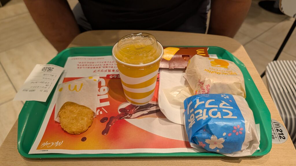 Yes, we started today at McDonald’s. I had a regular egg and muffin and Keith had a Japanese teriyaki sausage, egg, lettuce, mayonnaise muffin. We had the side package of strawberry cream cheese pie, hash browns, and orange juice. Keith thought the hash browns tasted Japanese.